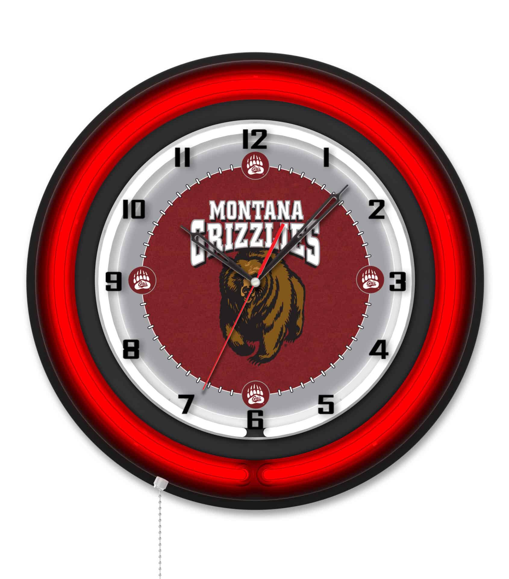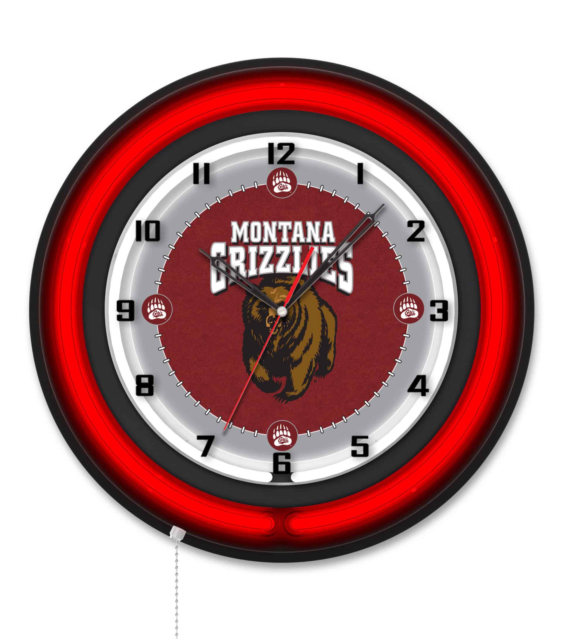 The University of Montana 19-Inch Neon Logo Clock in Black is a stunning addition to any man cave or sports-themed room. This clock features a sleek black casing and a vibrant neon outer ring in team colors, perfectly illuminating the custom printed clock face with a brilliant white inner neon ring. The neon rings can be easily turned on and off using a convenient pull chain located at the bottom of the clock, making it both functional and stylish. With accurate quartz movement powered by a single AA battery (not included), this clock ensures precise timekeeping. Show your school pride whether for yourself or as a gift for a recent grad or sports super fan!