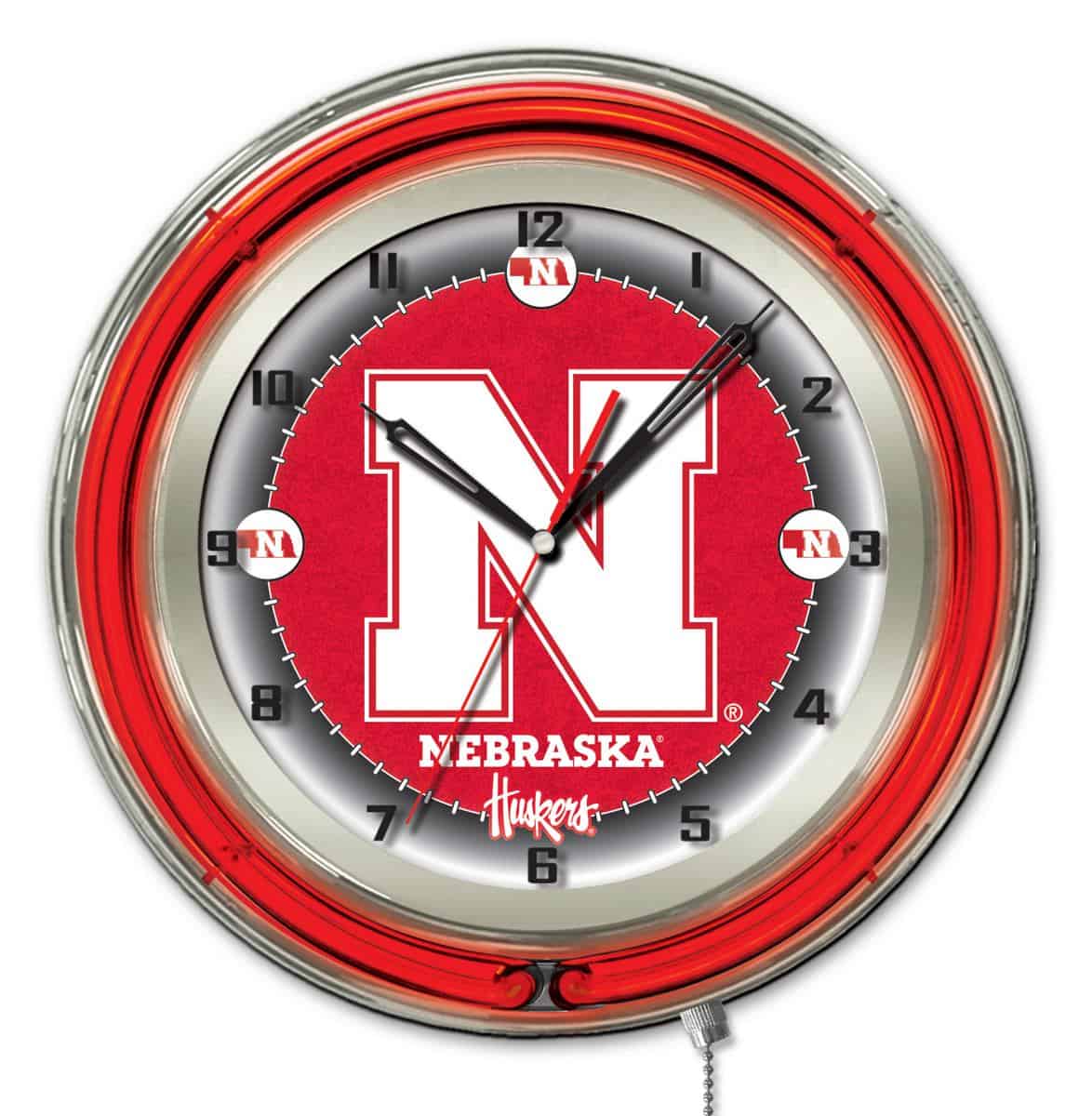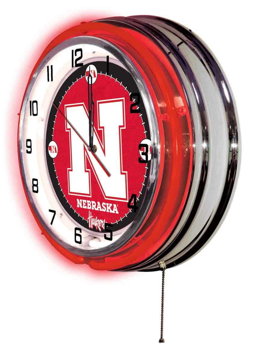 The University of Nebraska 19-Inch Neon Logo Clock in Chrome is the ultimate decor piece for any fan’s man cave. This striking clock combines vibrant team colors with an eye-catching chrome casing, making it a perfect statement piece. The double neon tubes not only highlight your team spirit but also provide illumination for easy visibility. With its accurate quartz movement, this clock ensures you never lose track of time while proudly displaying your school pride.