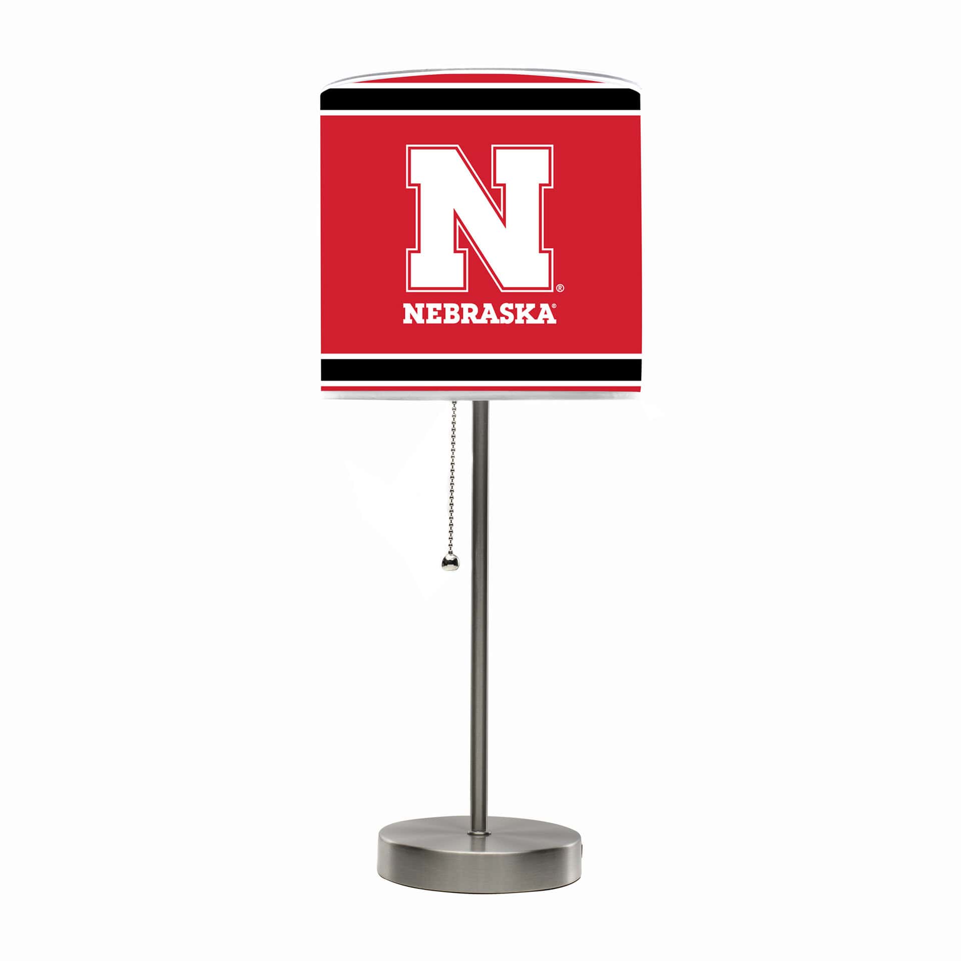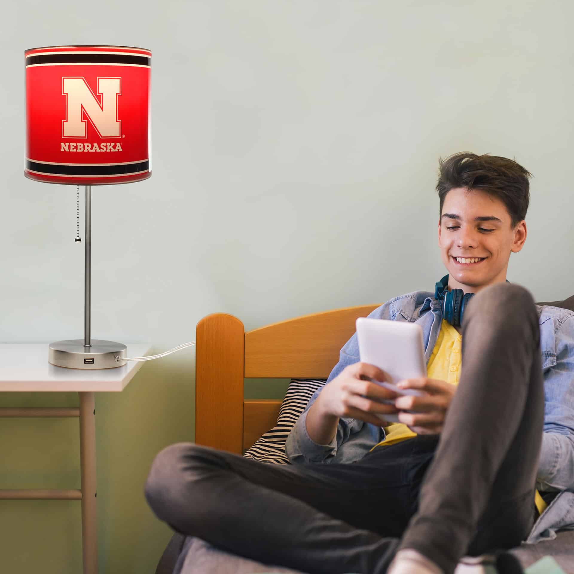 Show your Cornhuskers pride with this stylish Nebraska Cornhuskers Chrome USB Charging Lamp. This lamp features a sleek chrome base and a vibrant lamp shade insert showcasing your favorite team’s logo. The unique patented lamp shade program allows you to easily update your room’s decor by swapping out the insert with other designs. The USB charging station ensures your devices stay powered up. The dimensions (LxWxH) are 8 x 8 x 19 inches and the product weight is 3 lbs. The material is metal and plastic. Officially licensed by the NCAA.