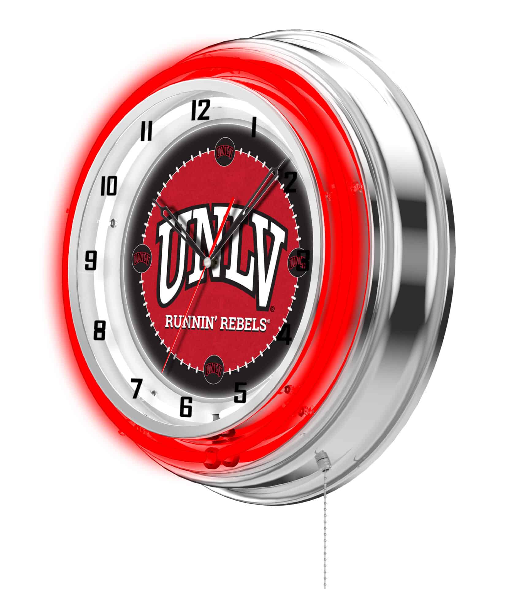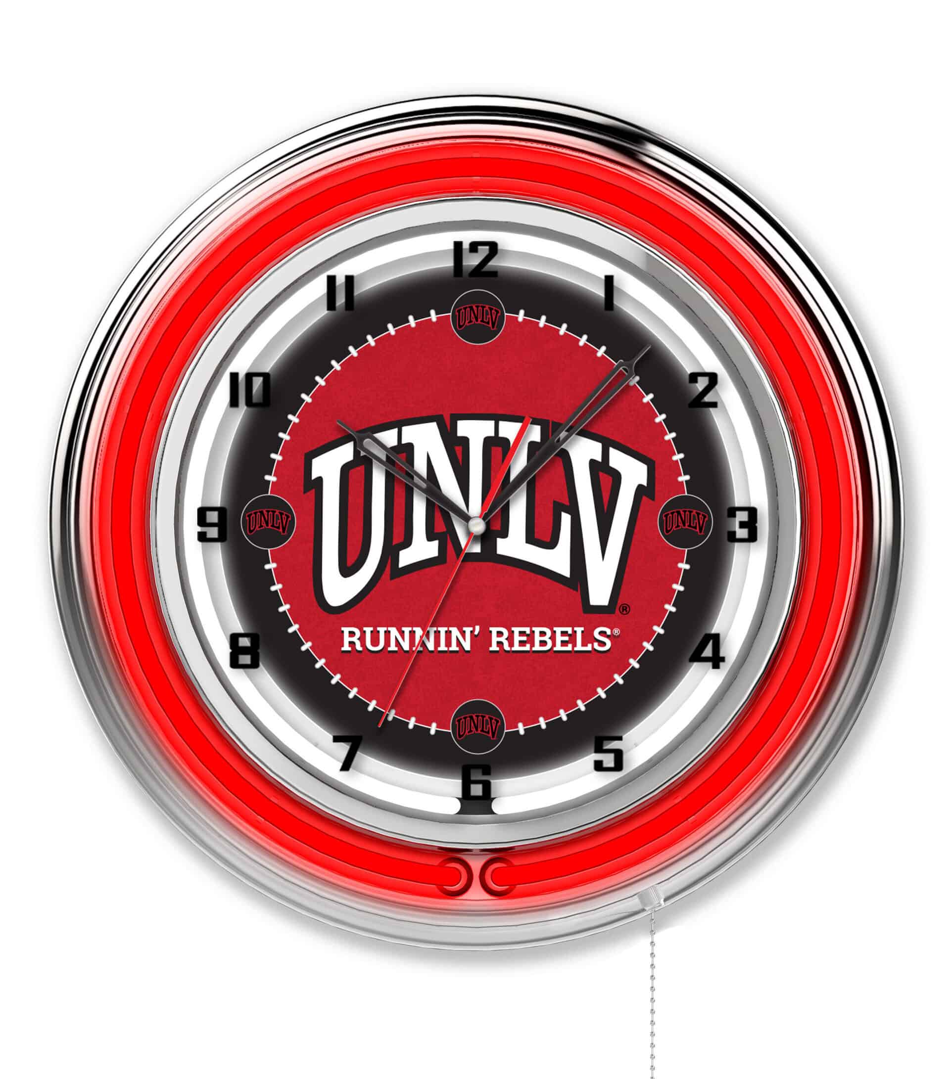 The “University of Nevada Las Vegas 19-Inch Neon Logo Clock in Chrome is the ultimate addition to any fan’s collection, showcasing your school pride in a striking way. This clock features a stunning chrome casing and vibrant neon accents, including a team color-specific outer ring and a brilliant white inner ring that illuminates the clock face. With its easy-to-use pull chain for turning the neon lights on and off, this clock not only keeps accurate time with its quartz movement but also enhances the décor of any room, making it a perfect gift for grads, sports enthusiasts, or a treat for yourself.