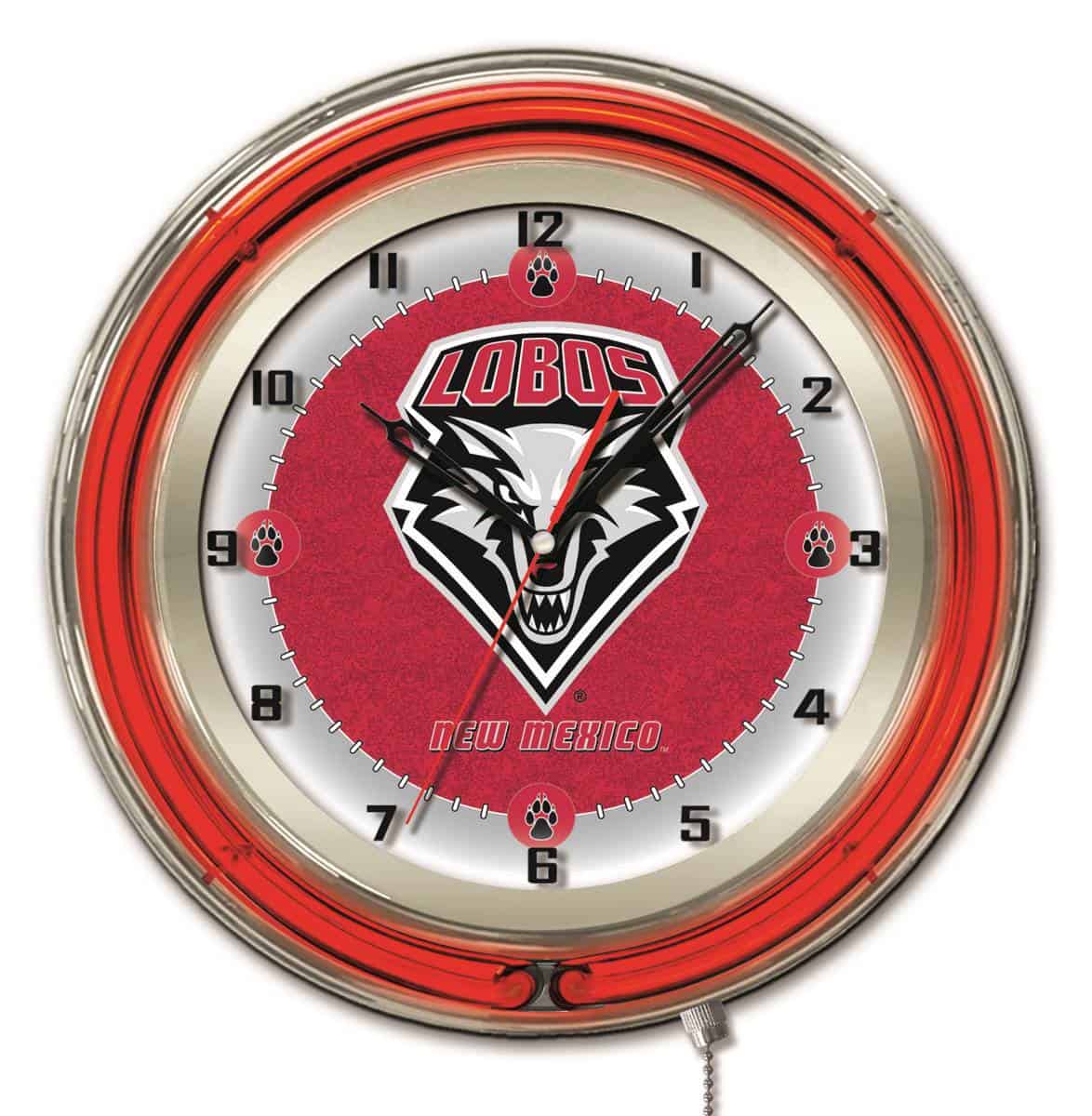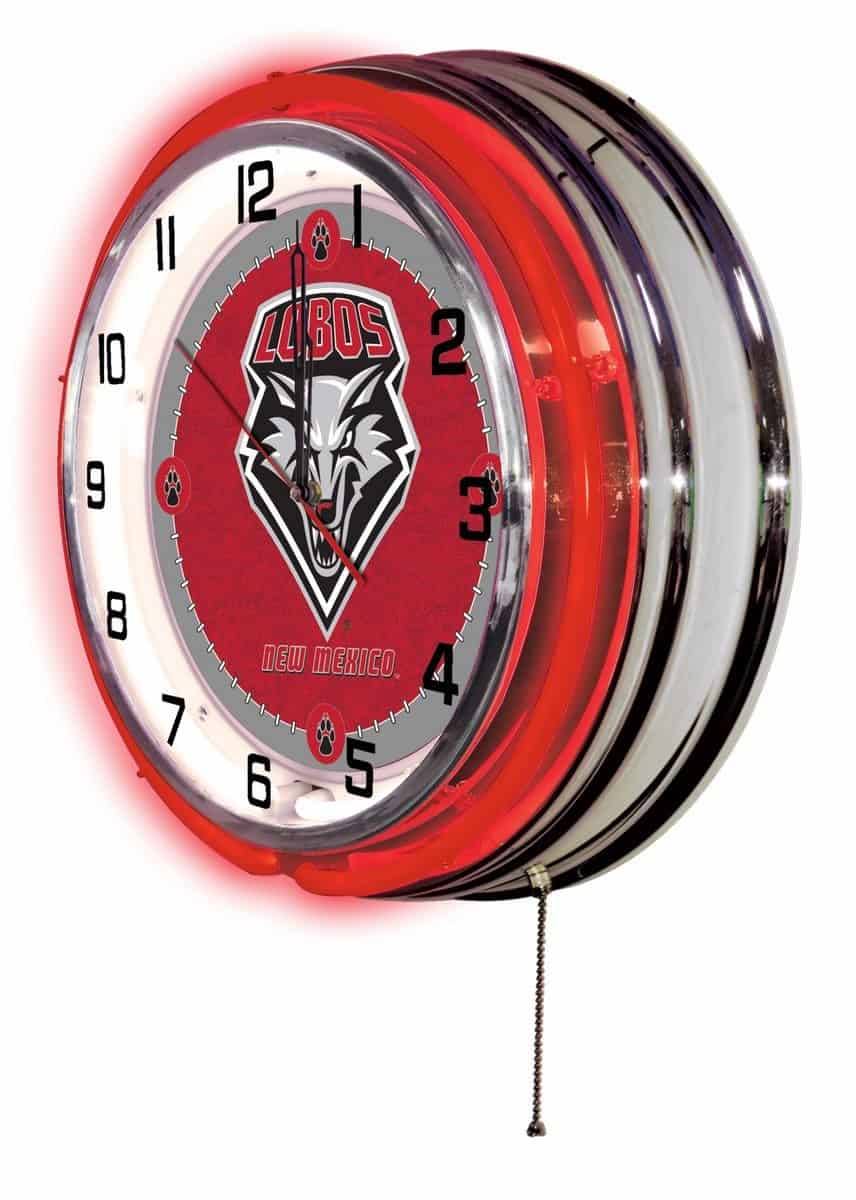 The University of New Mexico 19-Inch Neon Logo Clock in Chrome is the perfect addition to any man cave, showcasing your school pride in a vibrant and stylish way. This clock features an eye-catching chrome casing and a team color-specific neon outer ring, beautifully illuminating the custom printed clock face with a brilliant white inner neon ring. With its easy-to-use pull chain for switching the neon lights on and off and accurate quartz movement powered by a single AA battery, this clock combines functionality with flair. Whether you’re gifting it to a sports super fan or treating yourself, this clock is a standout piece for any space.