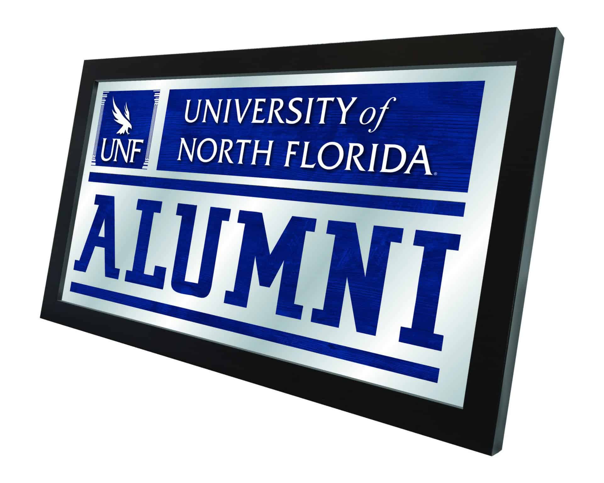 Show your school pride with the University of North Florida 26×15 Alumni Wall Mirror. With its simple yet elegant design, this mirror features vibrant school colors that burst through the 1/8″ thick glass, complemented by mirrored accents. The mirror is framed with a sleek black wood frame and includes saw tooth hangers for easy installation. Measuring 26 inches in height and 15 inches in width, it is perfect for your office, garage, or any room in your home. Whether you’re treating yourself or gifting a recent graduate, this mirror is a stylish addition that showcases your university spirit.