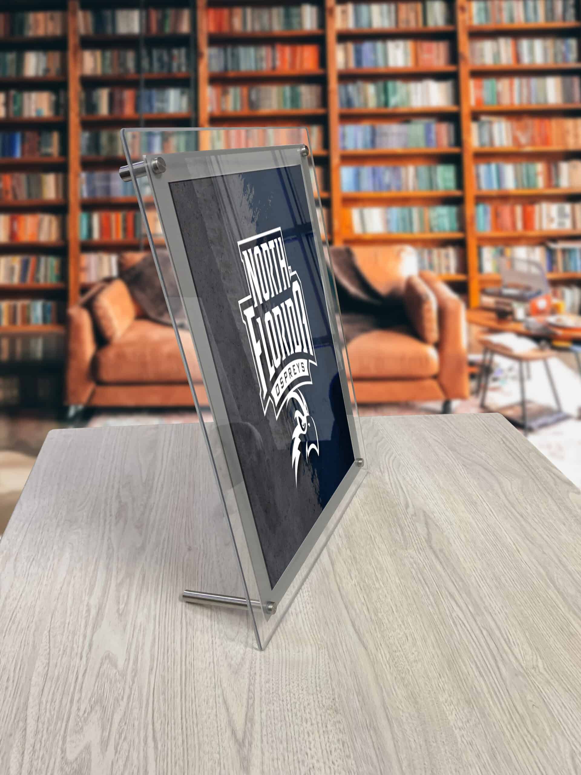 - Mounting: Includes hardware for wall mounting (1″ Stand-offs) or desktop display (3 3/4″ foot).