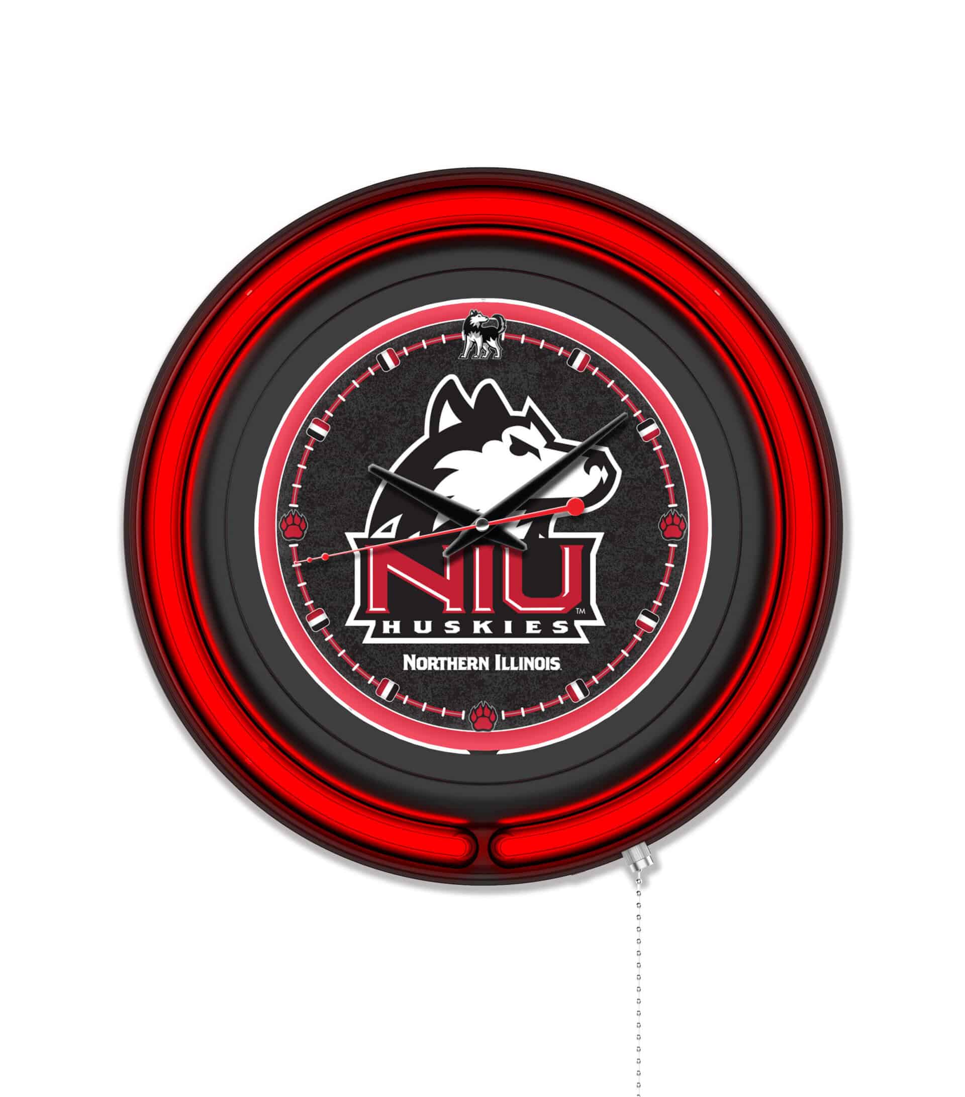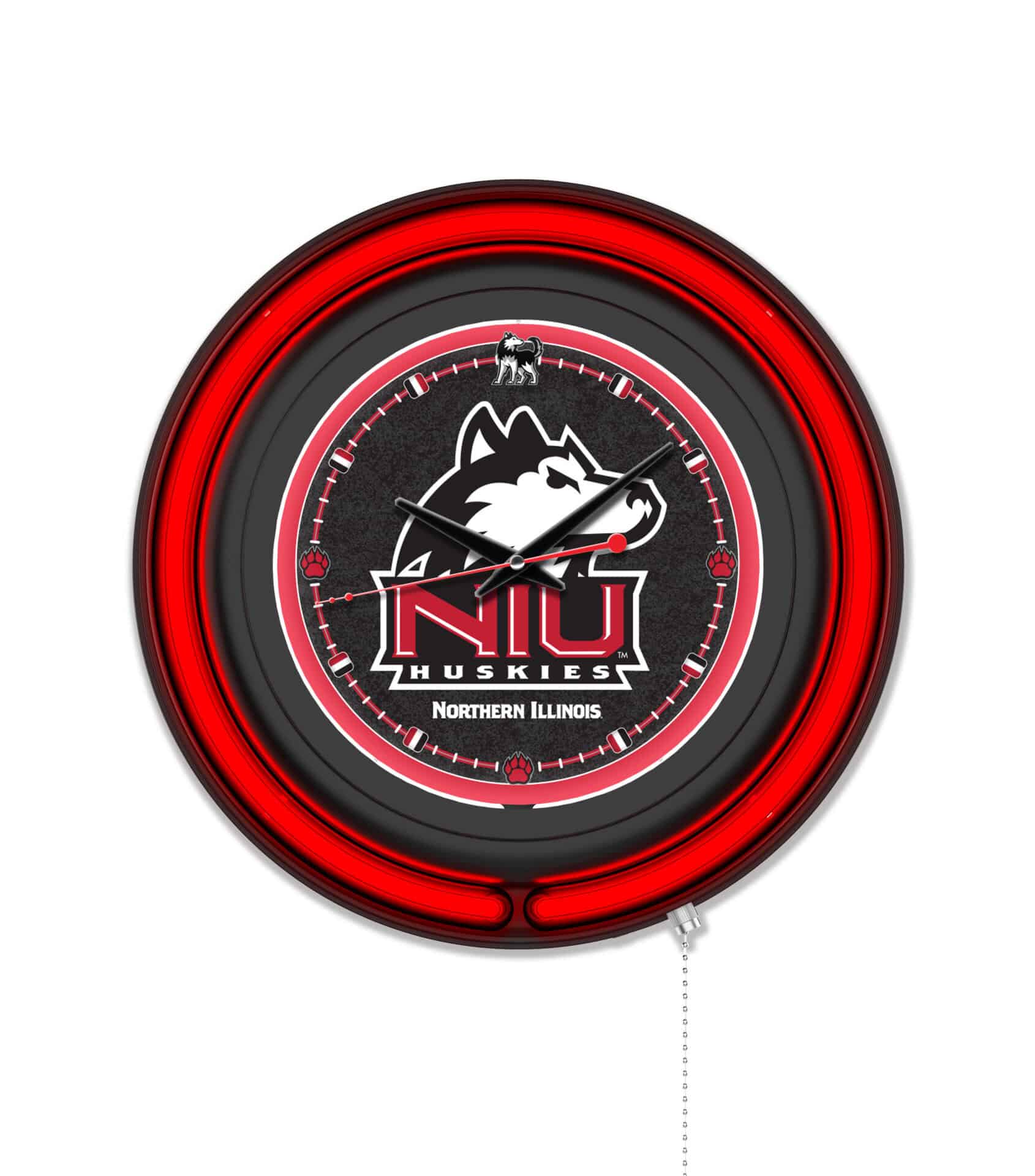 The University of Northern Illinois 15-Inch Neon Logo Clock in Black is the ultimate addition to your man cave, showcasing your school pride with style. This clock features a sleek black casing with vibrant neon accents that illuminate the custom printed clock face. The brilliant white inner neon ring and a team color-specific outer ring create a striking visual effect. The neon rings can be easily controlled with a pull chain, and the clock operates on a standard 120V outlet, ensuring convenience and ease of use. With accurate quartz movement powered by a single AA battery (not included), this clock not only serves as a decorative piece but also keeps you on time.