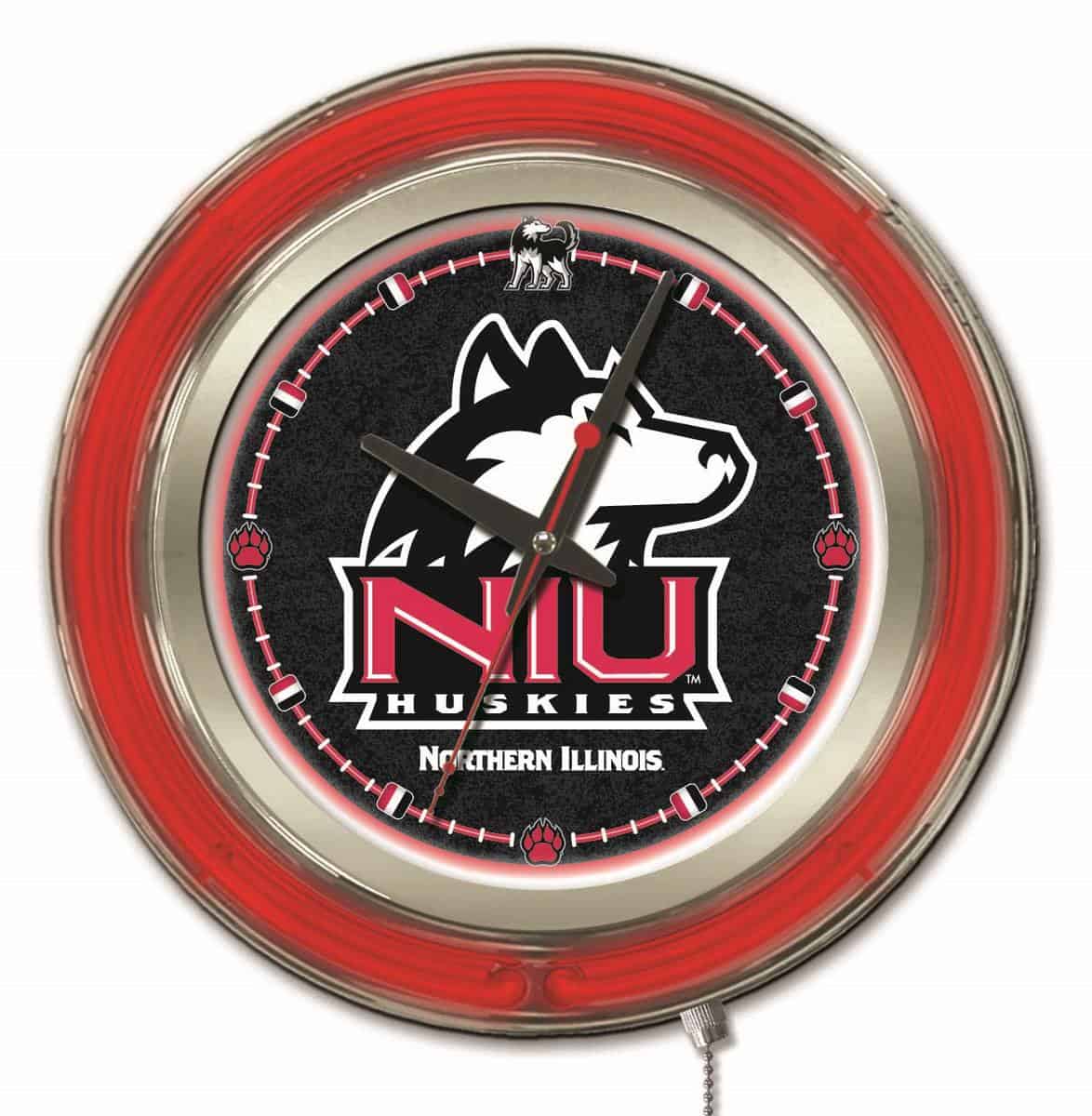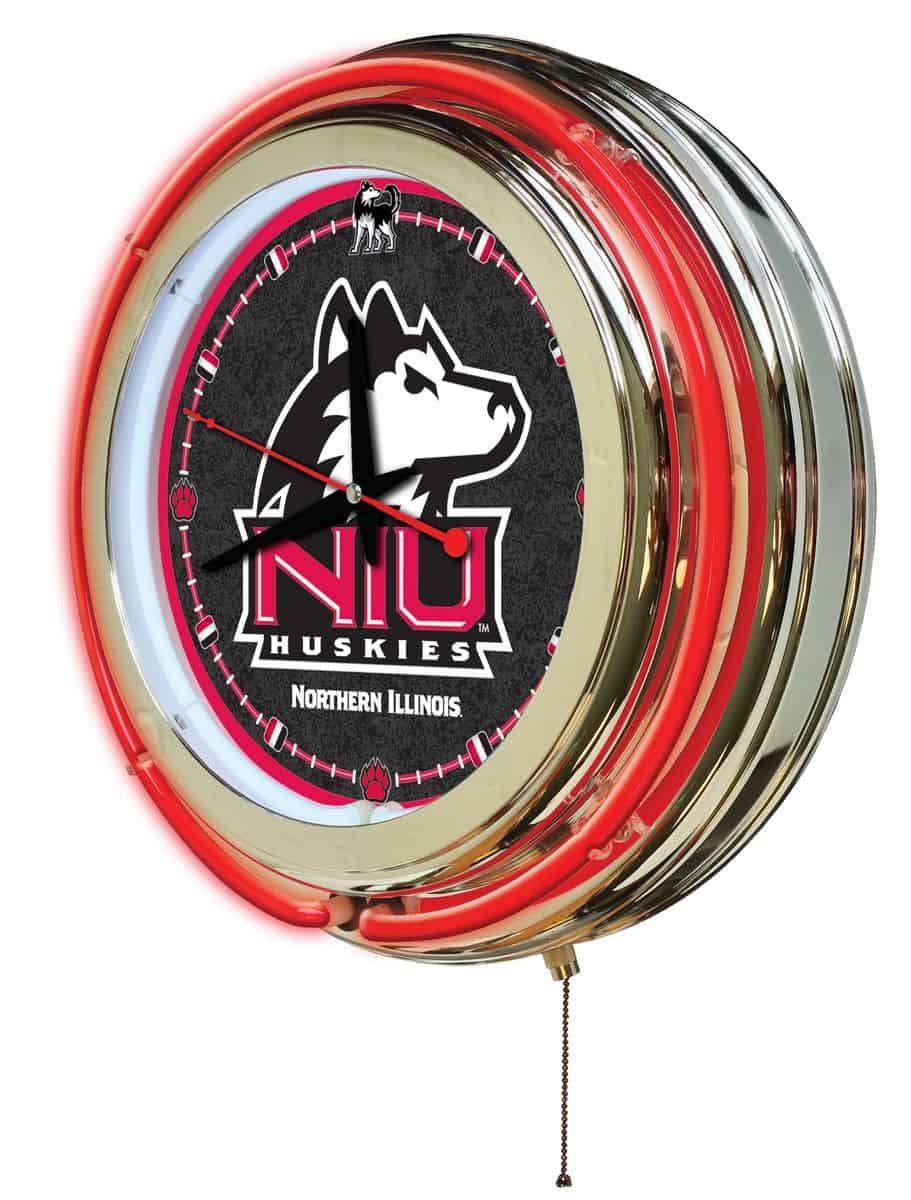 The University of Northern Illinois 15-Inch Neon Logo Clock in Chrome is the ultimate decor piece for any fan’s man cave. With its striking chrome casing and vibrant neon rings, this clock not only tells time but also showcases your school pride. The custom printed clock face is brilliantly illuminated by a white inner neon ring, making it a standout feature in any room. The neon lights can be easily controlled with a convenient pull chain, ensuring that you can set the ambiance to your liking.