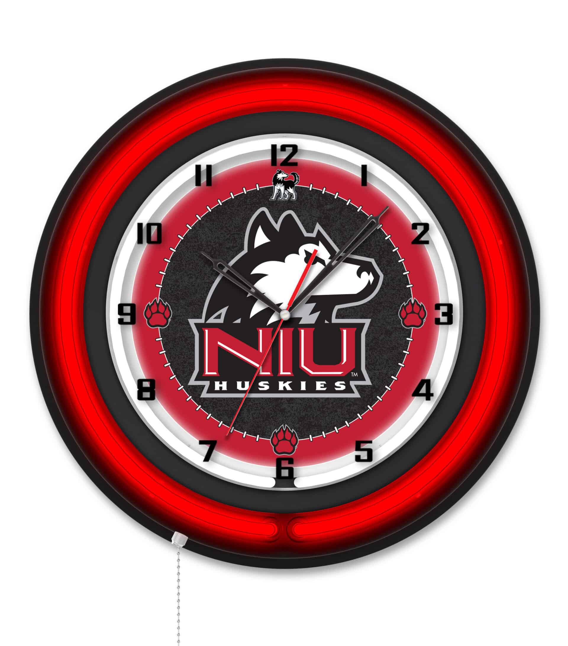 The University of Northern Illinois 19-Inch Neon Logo Clock in Black is the ideal addition to any man cave, showcasing your school pride with style. This clock features a sleek black casing complemented by a vibrant neon outer ring that matches your team’s colors, providing a stunning visual impact. The brilliant white inner neon ring illuminates the custom printed clock face, ensuring it stands out day and night. With easy operation via a pull chain and powered by a standard 120V outlet, this clock combines functionality with flair. Accurate quartz movement ensures you always have the right time, powered by a single AA battery (not included).