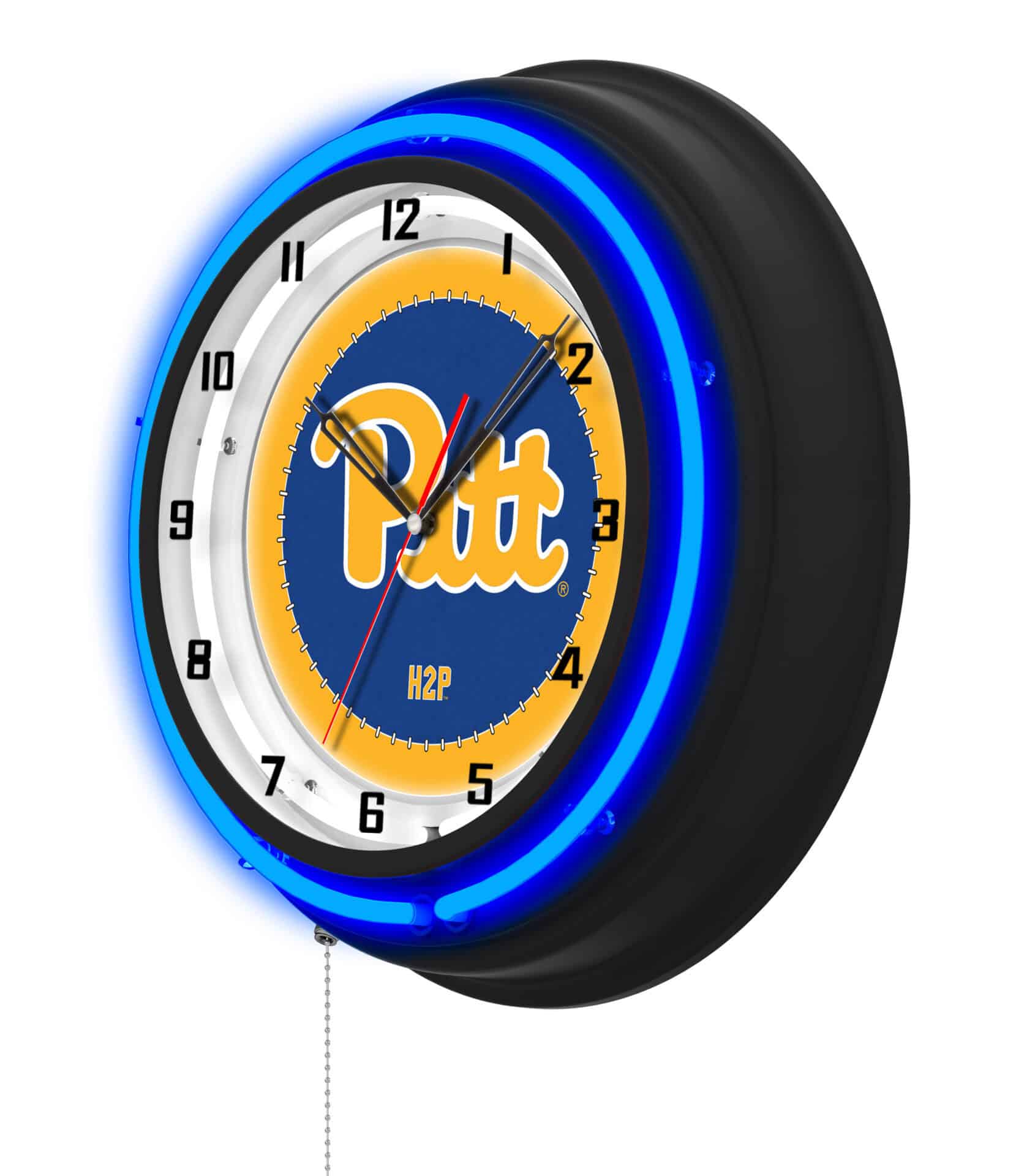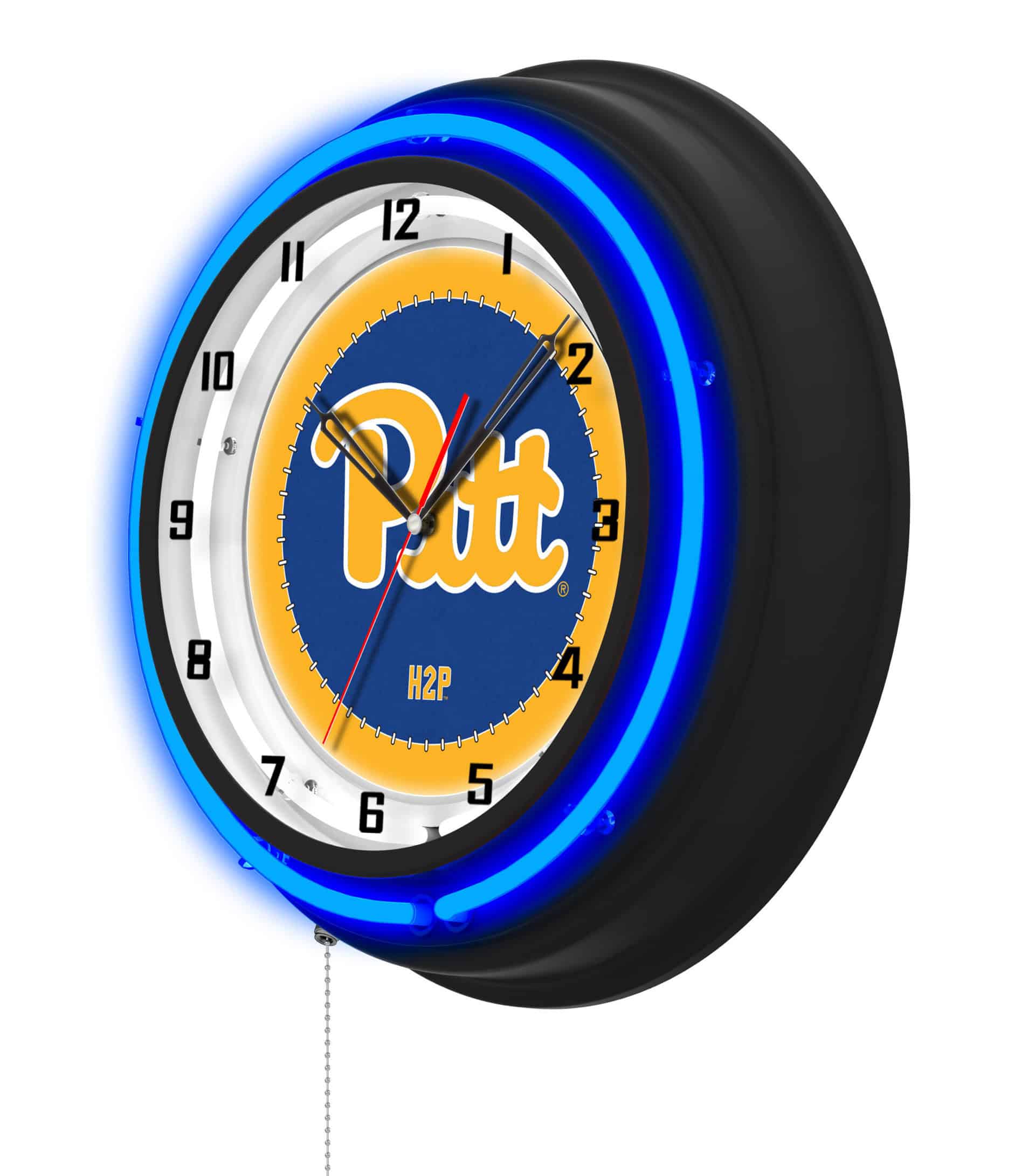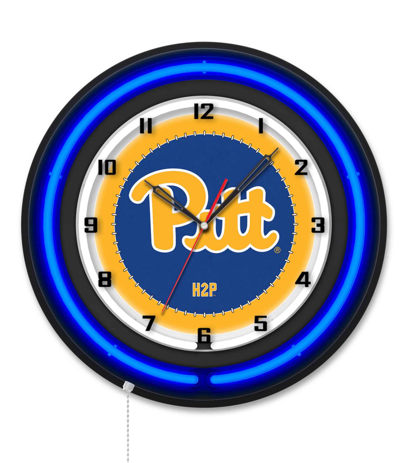 The University of Pittsburgh 19-Inch Neon Logo Clock in Black is the ultimate addition to any man cave, showcasing your school pride with vibrant colors and a sleek design. This stylish clock boasts a black casing and a neon outer ring in team colors, complementing the custom printed clock face illuminated by a brilliant white inner neon ring. The neon lights can be easily activated or deactivated via a convenient pull chain located at the bottom of the clock, making it both functional and eye-catching. Powered by a UL Listed transformer and standard 120V outlet, this clock guarantees accurate timekeeping with its quartz movement, using a single AA battery (not included). Perfect as a gift or a personal statement, this clock is designed for both style and functionality.