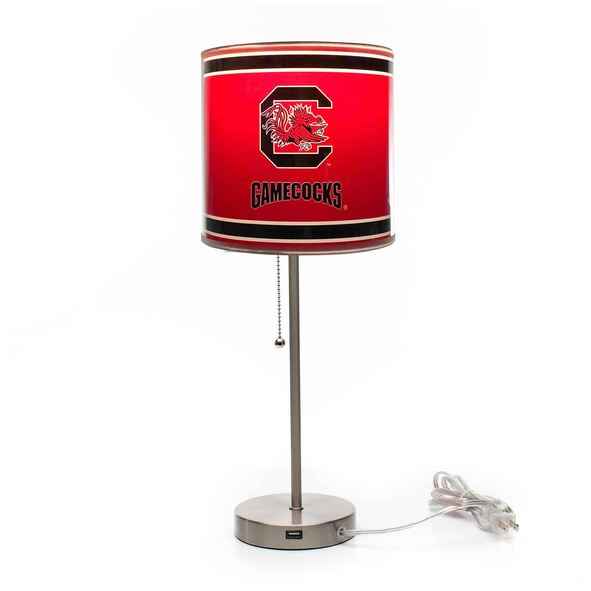 Show off your team pride with this South Carolina Chrome USB Charging Lamp. This lamp features a sleek chrome base and a vibrant team-themed lampshade insert. The high-resolution design is officially licensed by the NCAA. Changing your decor is easy with the unique patented lampshade program that allows you to swap out inserts affordably. Plus, the built-in USB charging station keeps your devices powered up. Dimensions (LxWxH): 8 x 8 x 19 inches. Product Weight: 3 lbs. Material: Metal and Plastic. It’s perfect for your fan cave, game room, or home office, adding a touch of team spirit to any space.