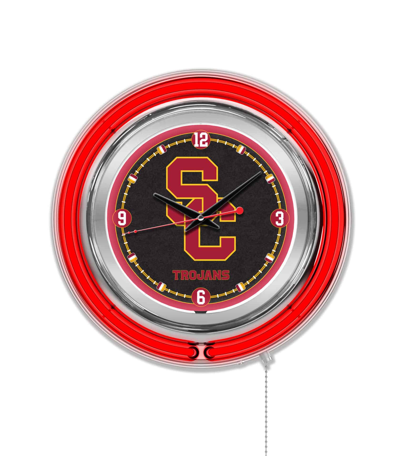 The University of Southern California 15-Inch Neon Logo Clock in Chrome is the perfect addition to any fan’s man cave, showcasing your school pride in a vibrant and stylish way. Featuring a sleek chrome casing and a neon outer ring in team colors, this clock not only serves as a functional timepiece but also as a striking piece of decor. The custom printed clock face is illuminated by a brilliant white inner neon ring, creating a stunning visual effect. With its easy-to-use pull chain for turning the neon lights on and off, and accurate quartz movement powered by a single AA battery (not included), this clock combines practicality with spirited design.