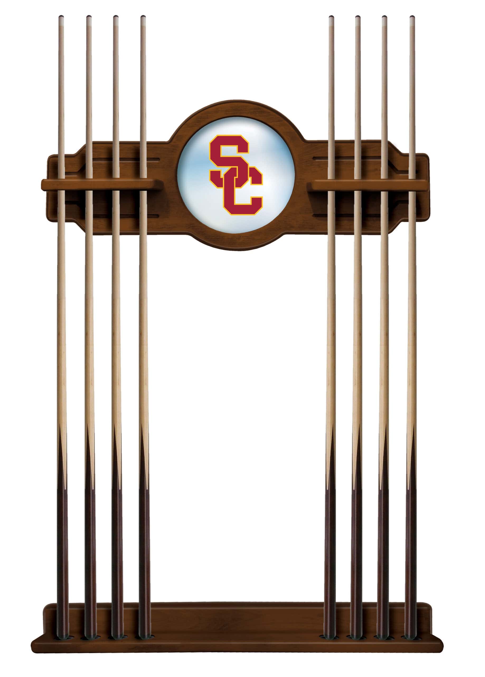 Elevate your game room with this premium University of Southern California Chardonnay Logo Cue Rack, designed to showcase your team spirit while providing a sophisticated storage solution for your pool cues. This high-end cue rack offers both functionality and style, featuring exceptional craftsmanship and officially licensed design.
