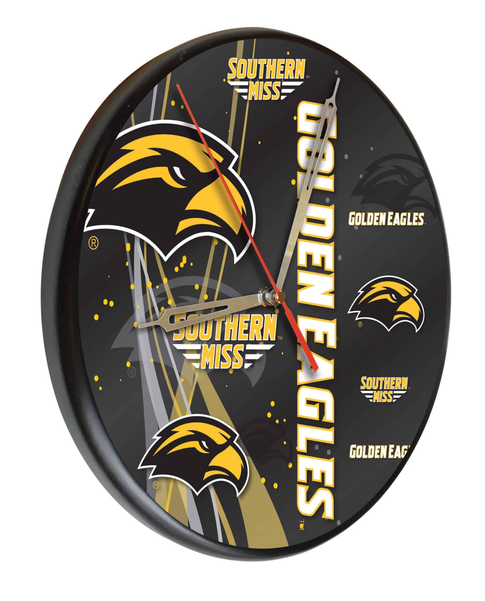 The University of Southern Mississippi 13-Inch Solid Wood Clock in Black is a stunning addition to any space, showcasing your school pride with elegance. Featuring first surface, digitally printed graphics that utilize UV inks for long-lasting vibrancy, this clock is designed to withstand the test of time. The accurate quartz movement ensures precise timekeeping, powered by a single AA battery (not included). Its recessed keyhole hanger allows for easy installation against the wall, creating a sleek and polished appearance. This clock makes a perfect gift for graduates, sports enthusiasts, or for personal use.