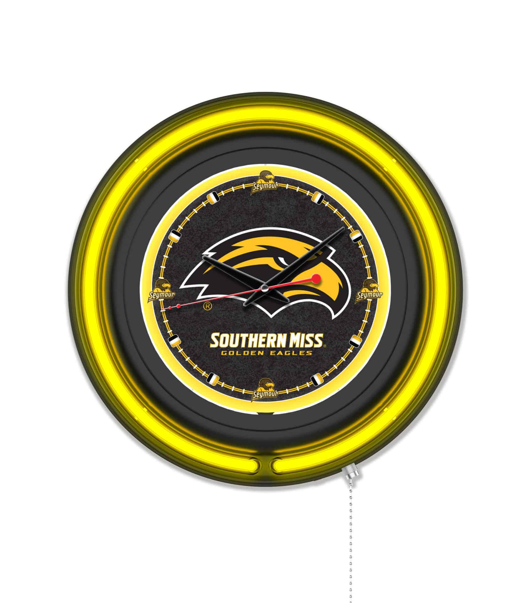 The University of Southern Mississippi 15-Inch Neon Logo Clock in Black is the perfect addition to any man cave, showcasing your school pride with vibrant, full-color artwork. This clock features a sleek black casing complemented by a team color-specific neon outer ring and a brilliant white inner neon ring that illuminates the custom-printed clock face. Easy to operate with a pull chain, this clock adds a unique touch to your space while ensuring accurate timekeeping with its quartz movement. An ideal gift for sports fans and graduates alike, this clock combines functionality and style effortlessly.