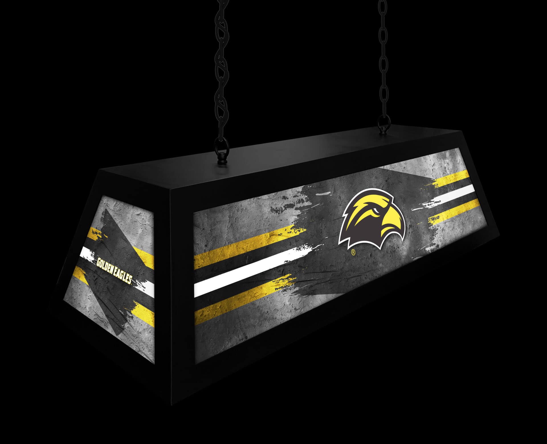 This light features a heavy-duty metal frame with a sleek black finish, complemented by a matching ceiling mount and durable hanging chains. The thick, shatter-resistant acrylic panels are digitally printed with UV cured ink, ensuring vibrant, long-lasting graphics. An on/off pull chain provides easy operation.