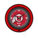 The University of Utah 15-Inch Neon Logo Clock in Black is a striking addition to any man cave, showcasing your school pride while offering functional timekeeping. With its vibrant neon rings and custom printed clock face, it adds a unique touch to your decor. The double neon tubes feature one accent color and a brilliant white inner ring that illuminates the clock face, making it a standout piece. The clock is easily operated with a pull chain for on/off functionality and is powered by a UL Listed transformer that connects to a standard 120V outlet. This clock not only keeps accurate time with its quartz movement but also requires just a single AA battery (not included) for operation. Whether as a gift for a graduate or a treat for yourself, this clock is a perfect choice for any sports enthusiast.
