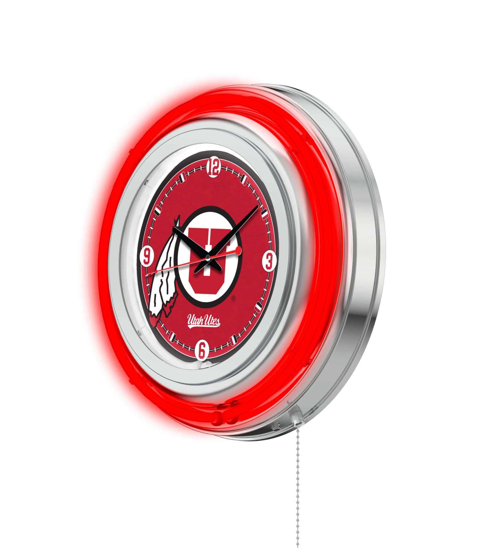 The University of Utah 15-Inch Neon Logo Clock in Chrome is the perfect centerpiece for any fan’s man cave. This eye-catching clock features a sleek chrome casing and vibrant team colors, boasting a stunning neon outer ring that highlights the custom printed clock face. A brilliant white inner neon ring illuminates the clock, ensuring it’s both stylish and functional. The clock is easily turned on and off with a convenient pull chain and is powered by a UL Listed transformer, making it a hassle-free addition to your decor. With accurate quartz movement, this clock keeps precise time powered by a single AA battery (not included). Ideal as a gift for graduates or sports enthusiasts, this clock showcases your school pride in a striking way.
