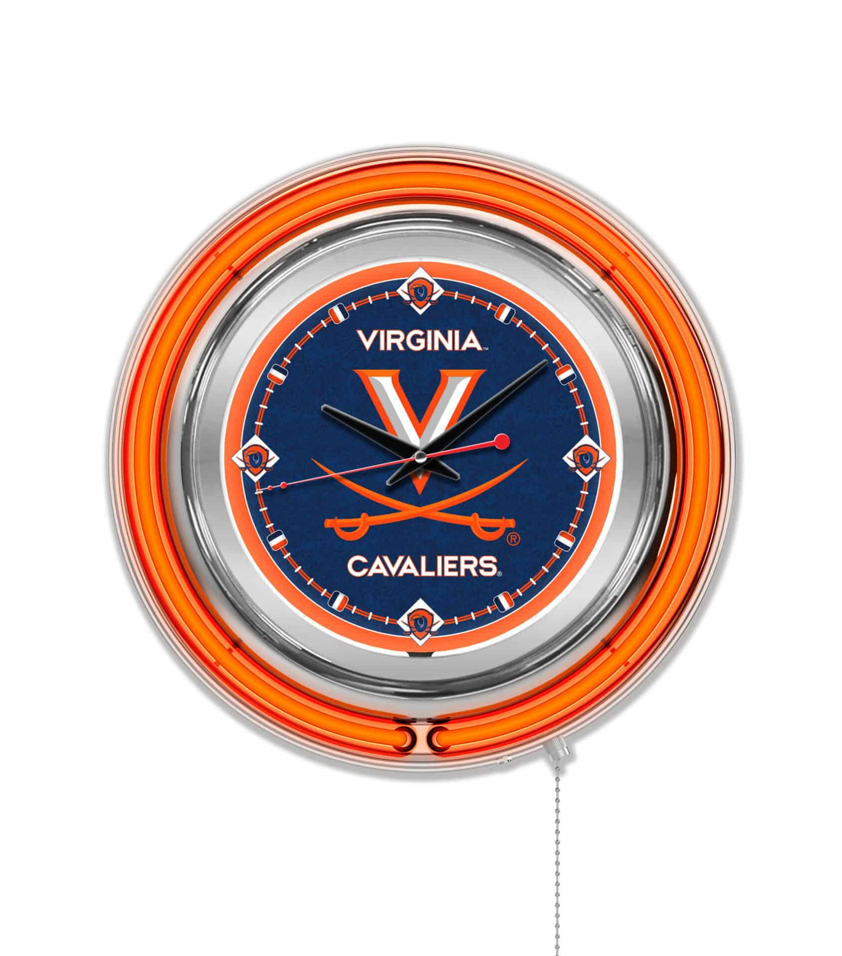 The University of Virginia 15-Inch Neon Logo Clock in Chrome is a striking addition to any man cave, showcasing vibrant school pride with its stunning design. This clock features a chrome casing and a team color-specific neon outer ring, perfectly complementing the custom printed clock face illuminated by a brilliant white inner neon ring. The neon rings are easily operated with a pull chain, and the clock is powered by a UL Listed transformer, making it convenient for any space. With accurate quartz movement and a single AA battery, this clock not only tells time but also serves as a captivating decor piece.