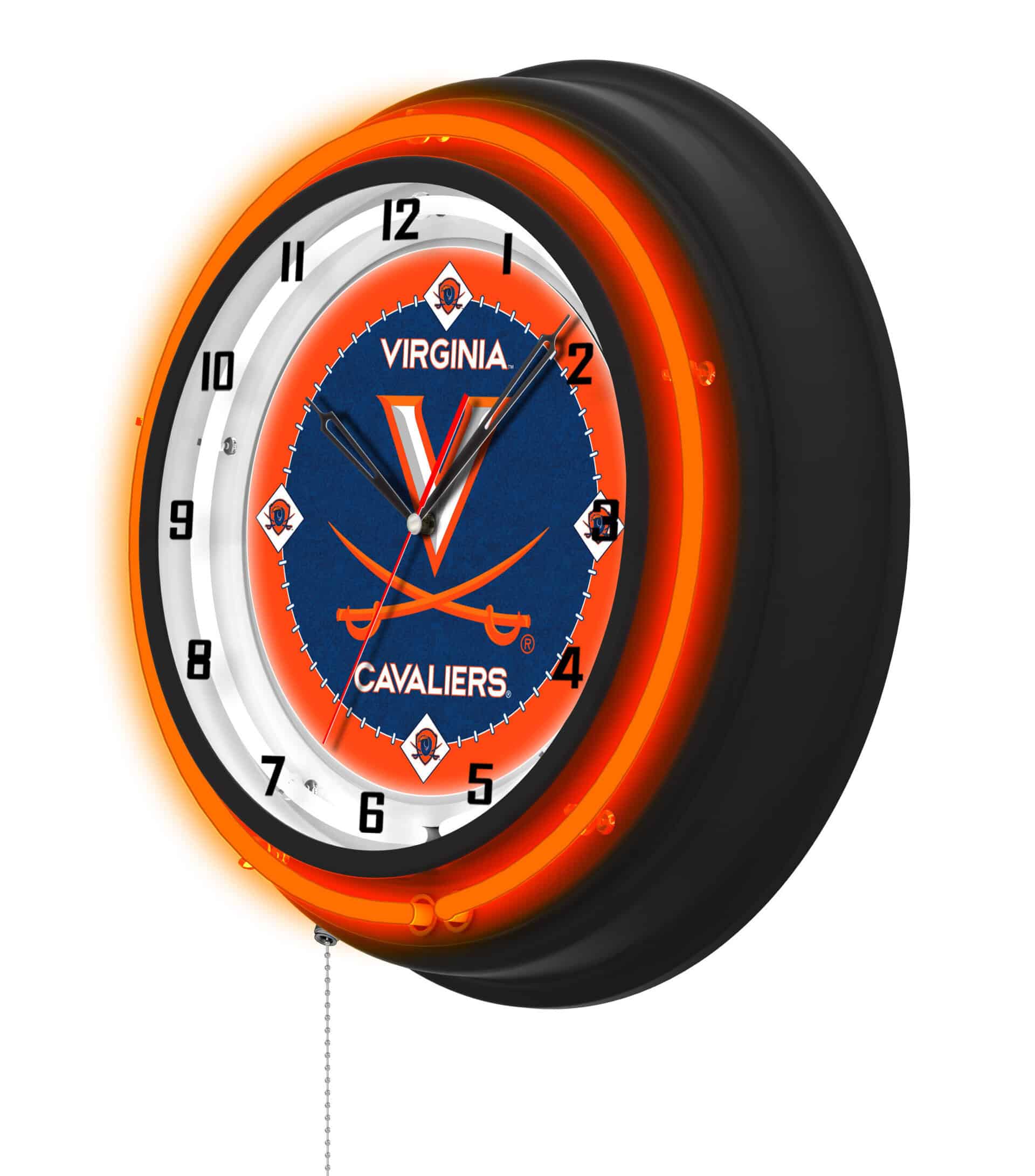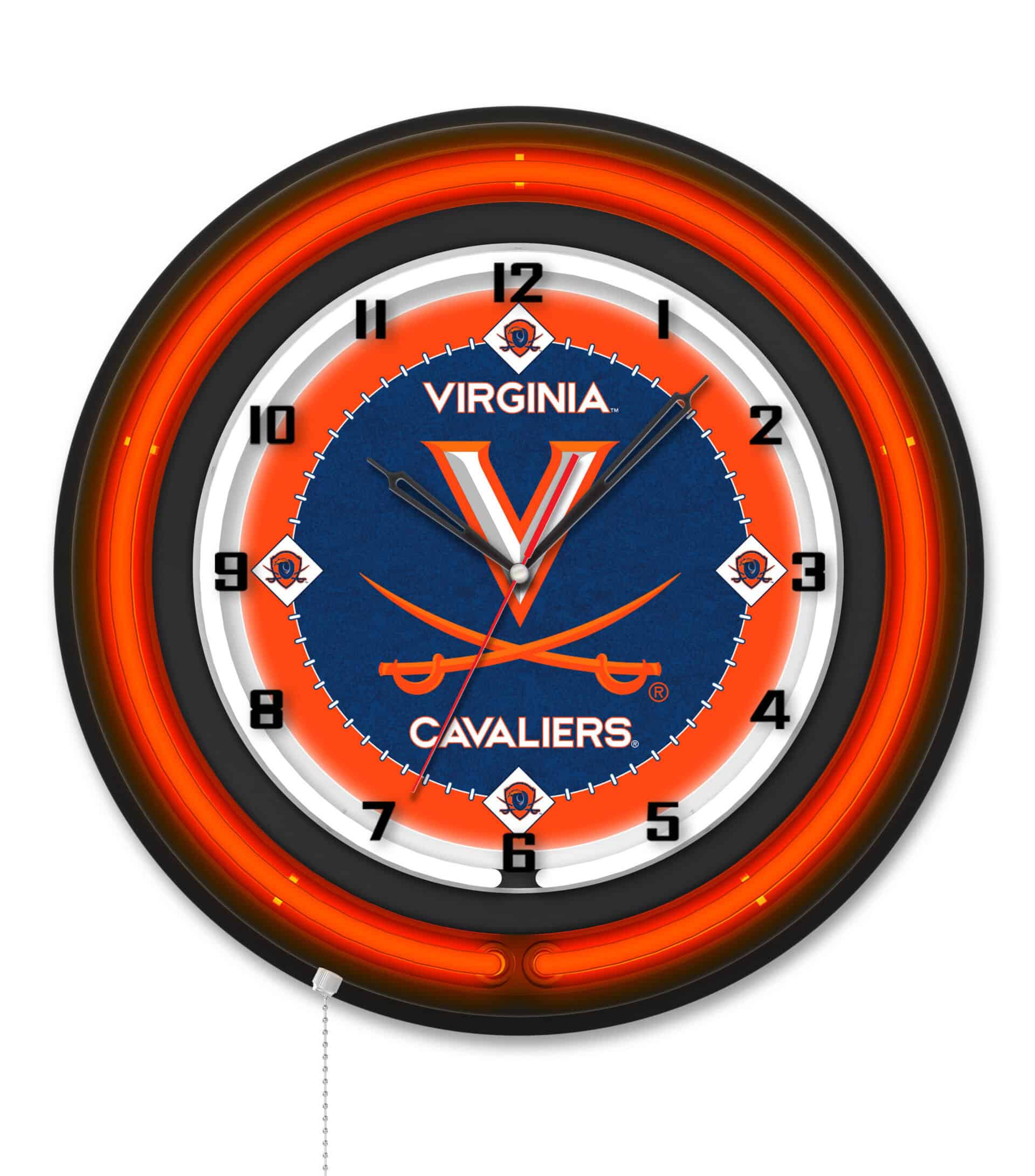The University of Virginia 19-Inch Neon Logo Clock in Black is the ultimate addition to any fan’s man cave. This stylish clock showcases vibrant, full-color artwork that proudly displays your school spirit. With its striking black casing and dual neon rings, this clock not only tells time but also enhances the ambiance of your space. The neon rings, easily controlled by a pull chain, create a mesmerizing glow, while the accurate quartz movement ensures you never miss a moment.