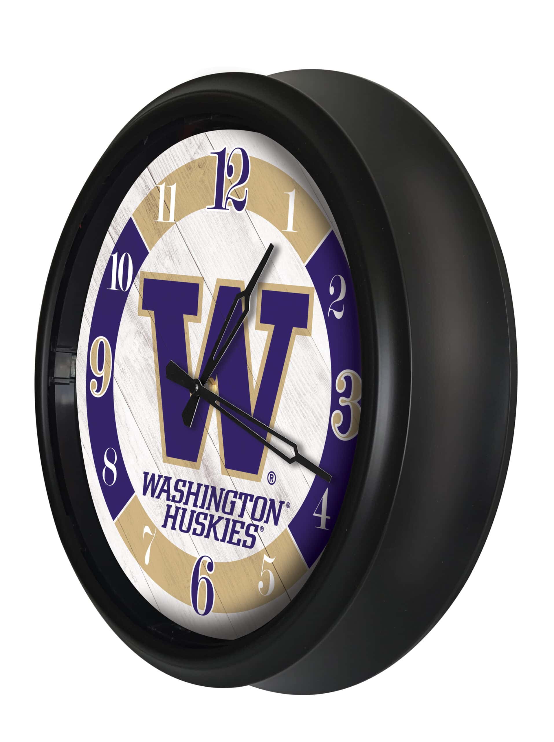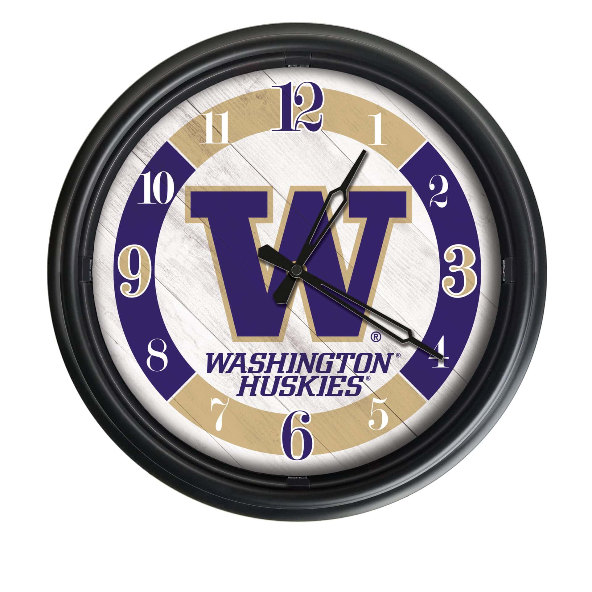 The University of Washington 14-Inch Indoor/Outdoor LED Wall Clock in Black combines functionality and style, making it the perfect addition to any space. This clock is designed for both indoor and outdoor use, thanks to its weather-resistant construction and vibrant, fade-free artwork. The clock features four LED lights that are photo eye controlled, automatically illuminating the clock face in low light conditions. With accurate quartz movement and a sleek black design, this clock not only keeps you on time but also showcases your school pride.
