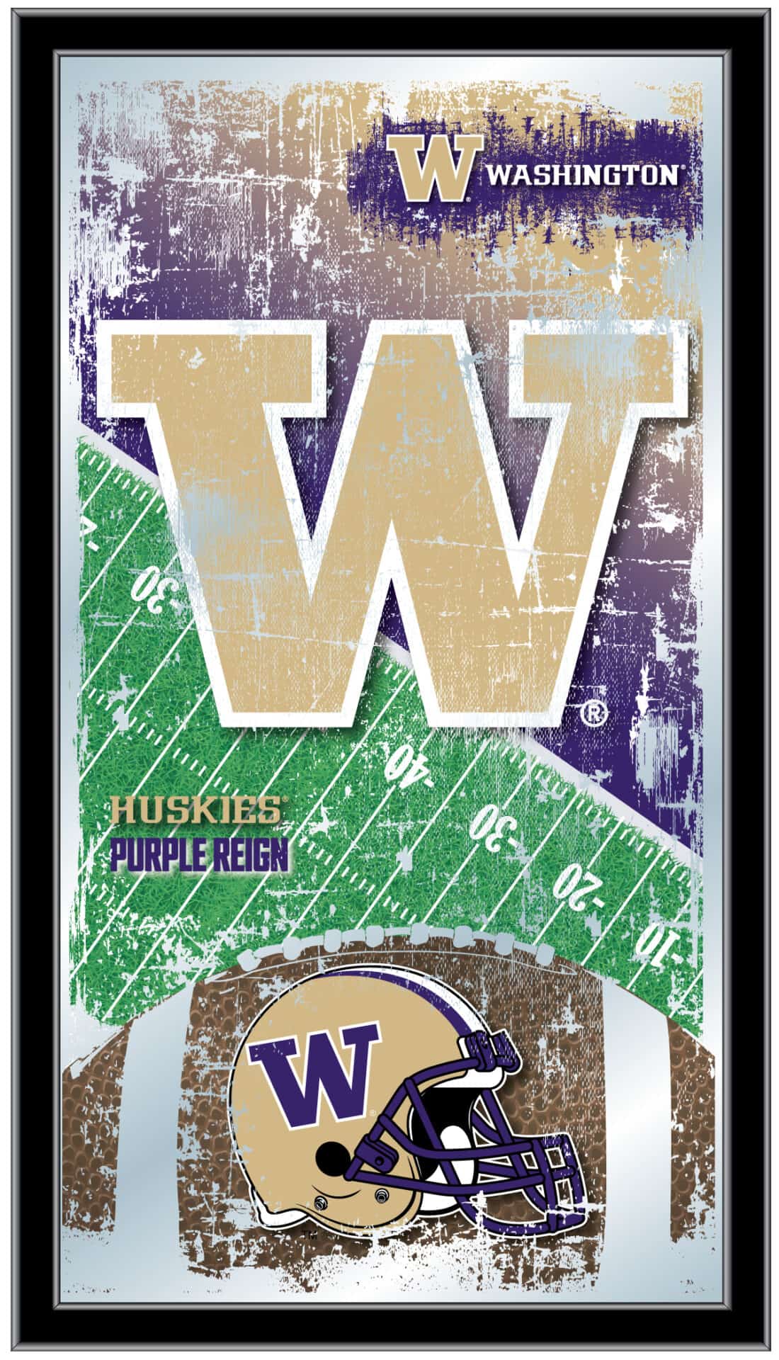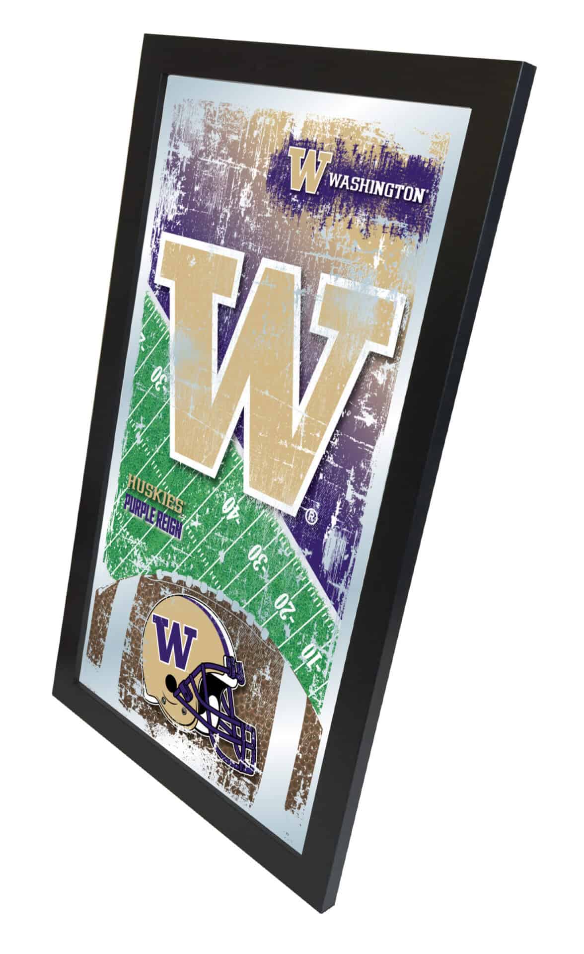 Show your school pride with this Official Licensed Football Mirror. With its simple yet elegant design, vibrant colors burst through the 1/8″ thick glass and are beautifully highlighted by the mirrored accents. Framed with a sleek black 1 1/4″ wrapped wood frame and equipped with dual saw-tooth hangers, this 15″(H) x 26″(W) mirror is perfect for your office, garage, or any room in your home. Whether you’re purchasing as a gift for a recent grad, a sports super fan, or for yourself, you can take satisfaction in knowing you’re choosing a mirror that is proudly made in the USA.
