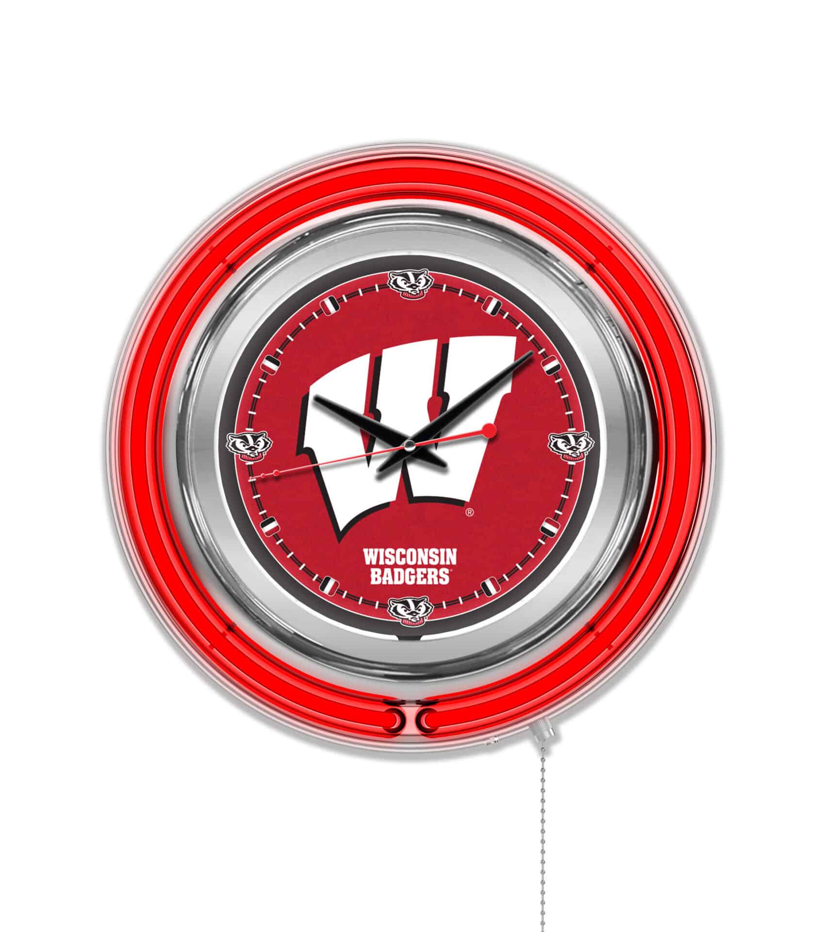 The University of Wisconsin (W) 15-Inch Neon Logo Clock in Chrome is the ultimate addition to your man cave, showcasing your school pride with style. This clock features a stunning chrome casing and vibrant neon accents that illuminate the custom printed clock face. The brilliant white inner neon ring provides excellent visibility while the outer neon ring complements your team colors. With a convenient pull chain for easy on/off operation, this clock is powered by a UL Listed transformer for standard outlets and runs on a single AA battery (not included) for accurate timekeeping. Ideal as a gift for graduates, sports fans, or for personal enjoyment, this clock is a statement piece made with quality craftsmanship.