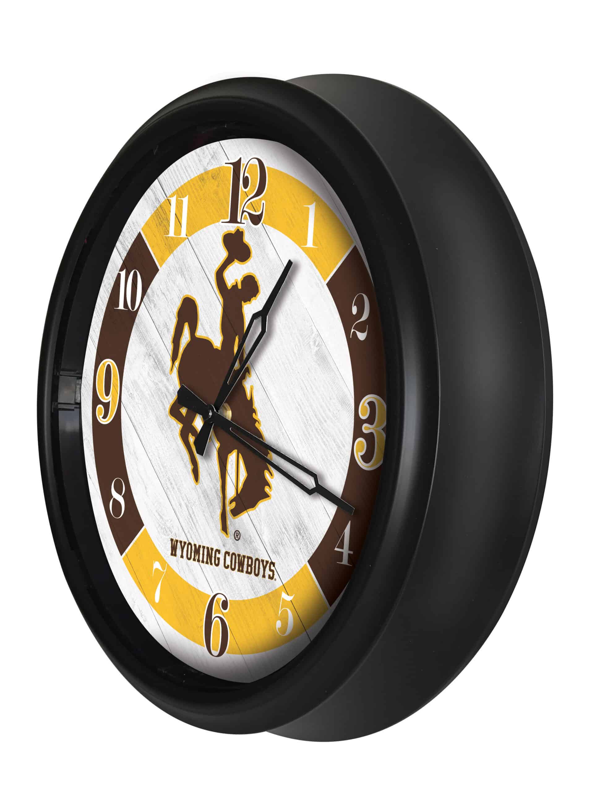 The University of Wyoming 14-Inch Indoor/Outdoor LED Wall Clock in Black is the perfect addition to any space, showcasing your school pride while providing functionality. This clock is designed to withstand outdoor conditions, featuring a durable casing made from UV resistant black ABS plastic. The glass face lens is equipped with a rubber gasket, ensuring protection against the elements. It includes four LED lights that automatically illuminate the clock face when it gets dark, providing visibility at all hours. With vibrant, fade-free artwork printed using UV inks, this clock not only tells time but also enhances your decor. Powered by batteries, it is hassle-free and requires no electrical outlet.