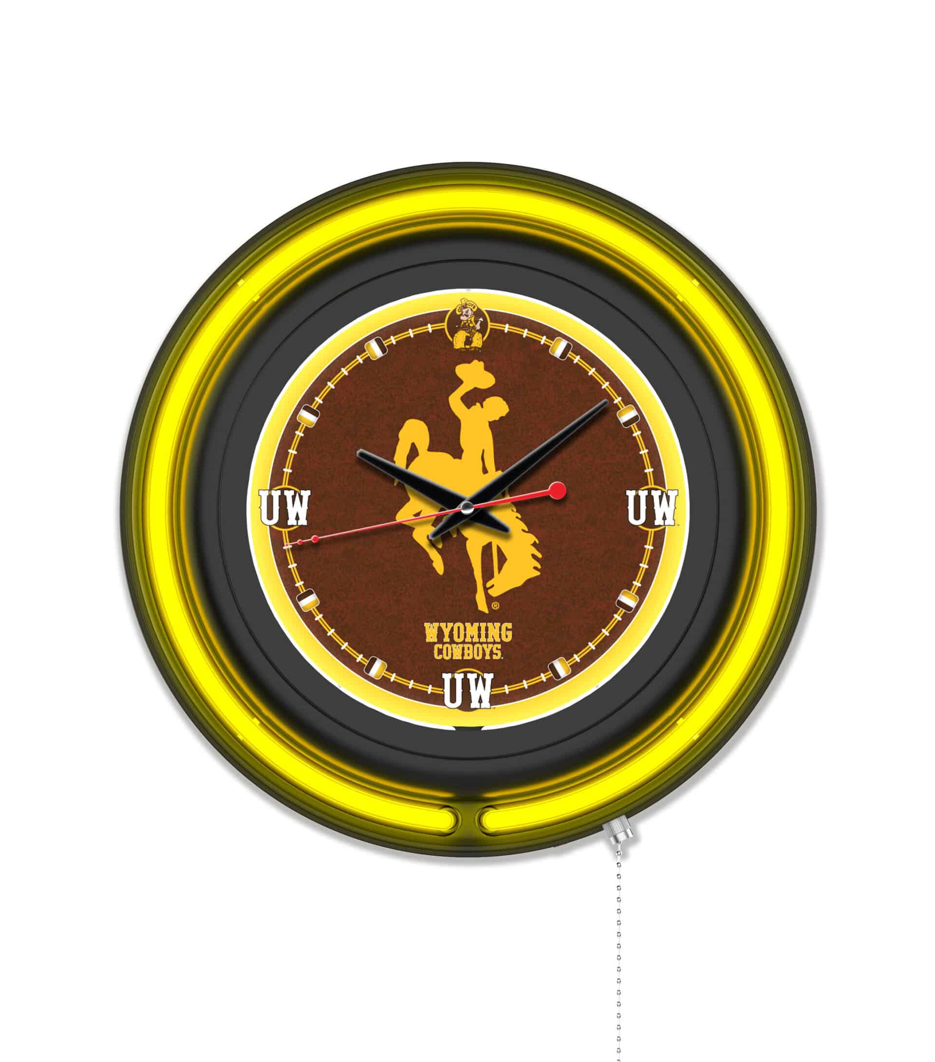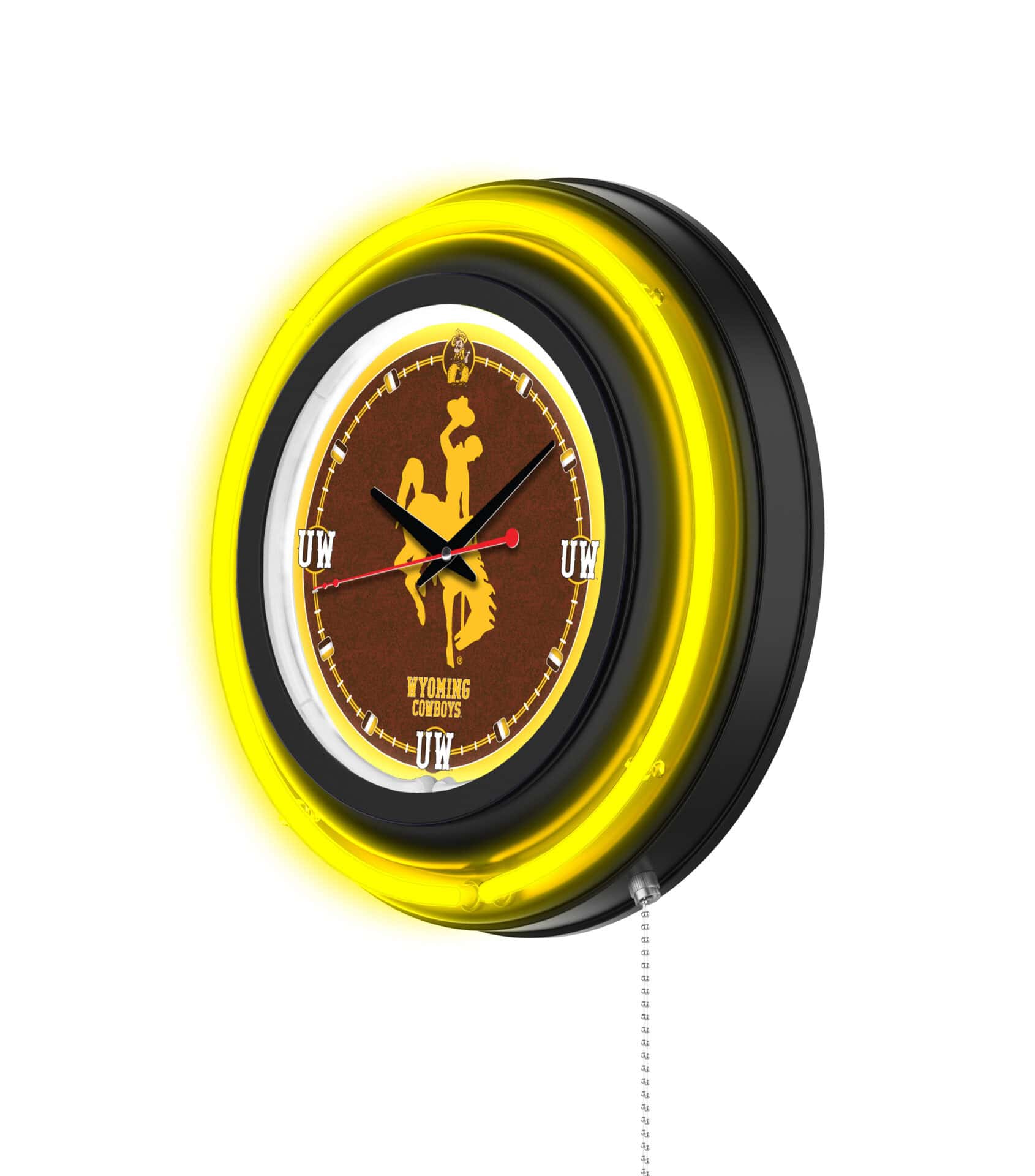 The University of Wyoming 15-Inch Neon Logo Clock in Black is a stunning addition to any man cave or sports fan’s collection. This clock features a sleek black casing and vibrant neon accents that illuminate the custom printed clock face, displaying your school pride in style. The brilliant white inner neon ring enhances visibility and adds a dynamic touch. Designed for convenience, the neon rings can be easily turned on and off with a pull chain. With accurate quartz movement powered by a single AA battery, this clock ensures you stay on time while showcasing your team spirit.