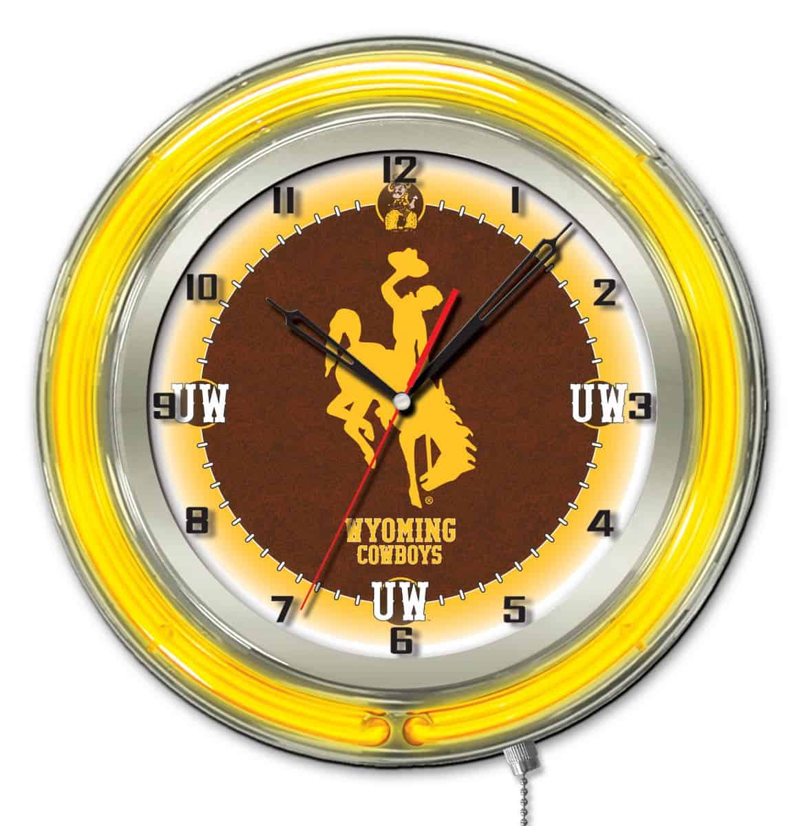 The University of Wyoming 19-Inch Neon Logo Clock in Chrome is the perfect addition to your man cave, showcasing your school spirit in a vibrant and stylish way. This clock features a stunning chrome casing complemented by a team color-specific neon outer ring, illuminating a custom printed clock face with a brilliant white inner neon ring. The easy-to-use pull chain allows you to turn the neon lights on and off effortlessly, while the accurate quartz movement ensures you always keep track of time. Ideal as a gift for graduates, sports fans, or for personal use, this clock combines functionality with striking design.