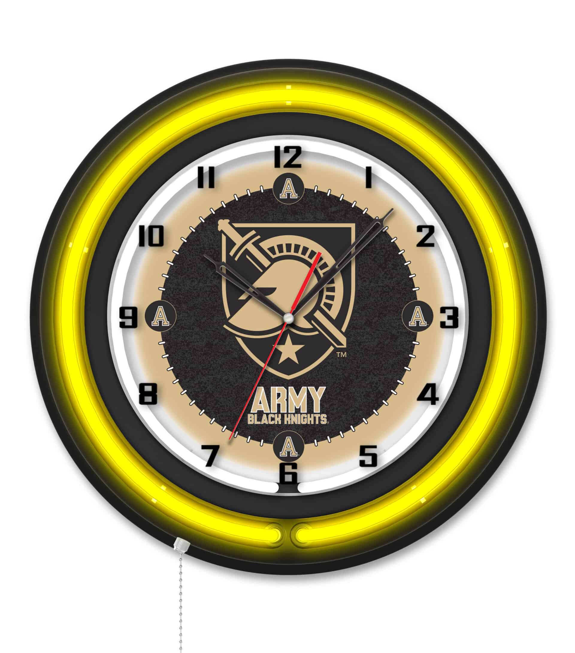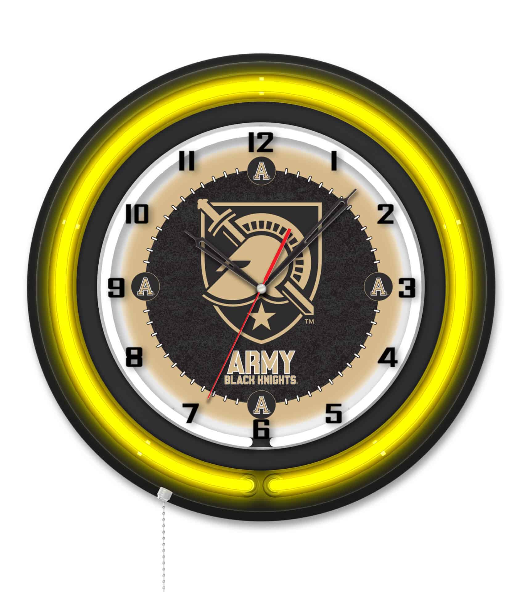 The US Military Academy 19-Inch Neon Logo Clock in Black is a stunning piece of decor that showcases your school pride. With its sleek black casing and vibrant neon rings, this clock not only tells time but also serves as a striking visual element for any space. The clock features a custom printed face illuminated by a brilliant white inner neon ring, creating an eye-catching display. The neon lights are easily controlled with a pull chain, and the clock is powered by a UL Listed transformer for hassle-free operation. Accurate quartz movement ensures you’ll always be on time.