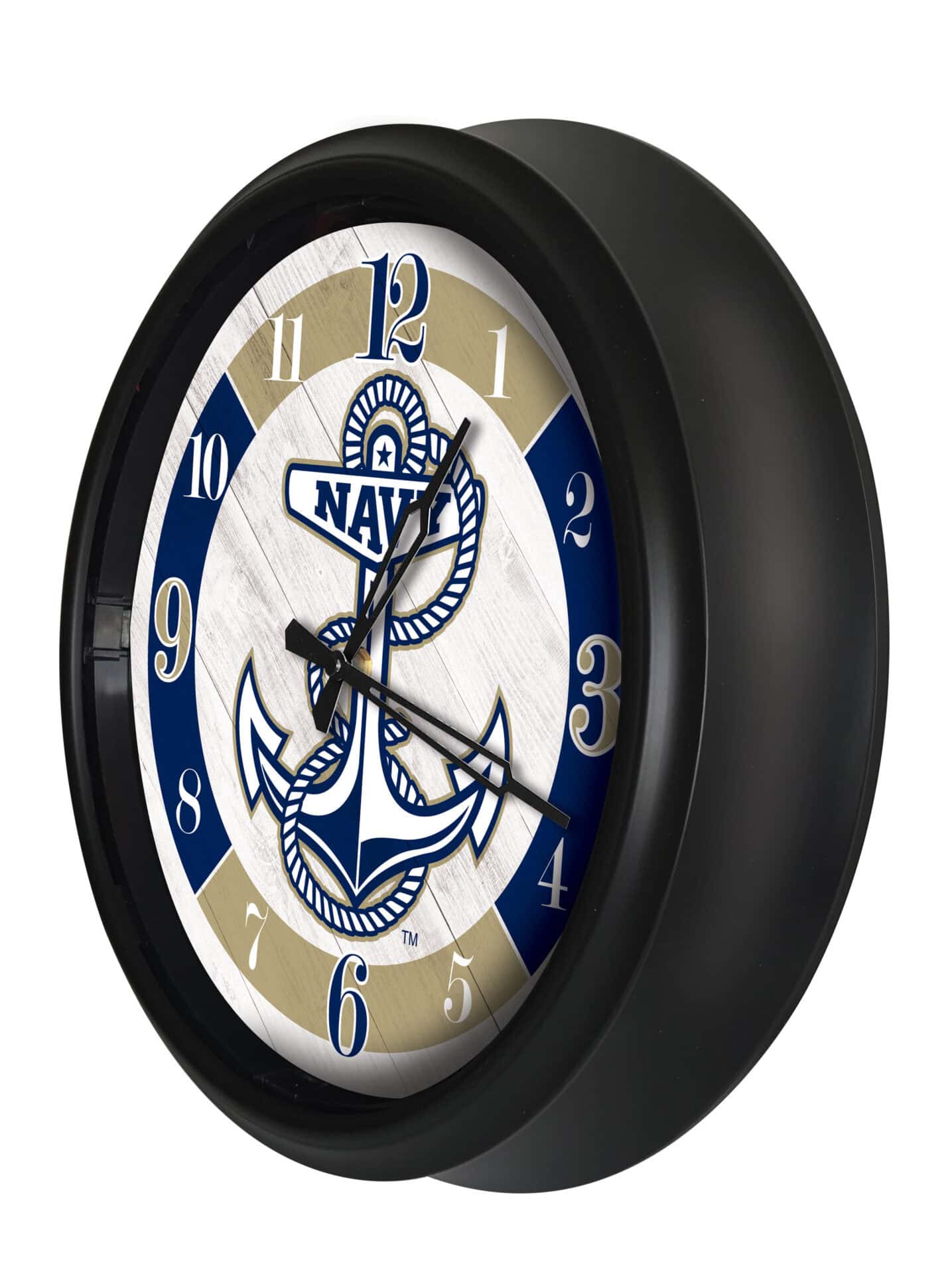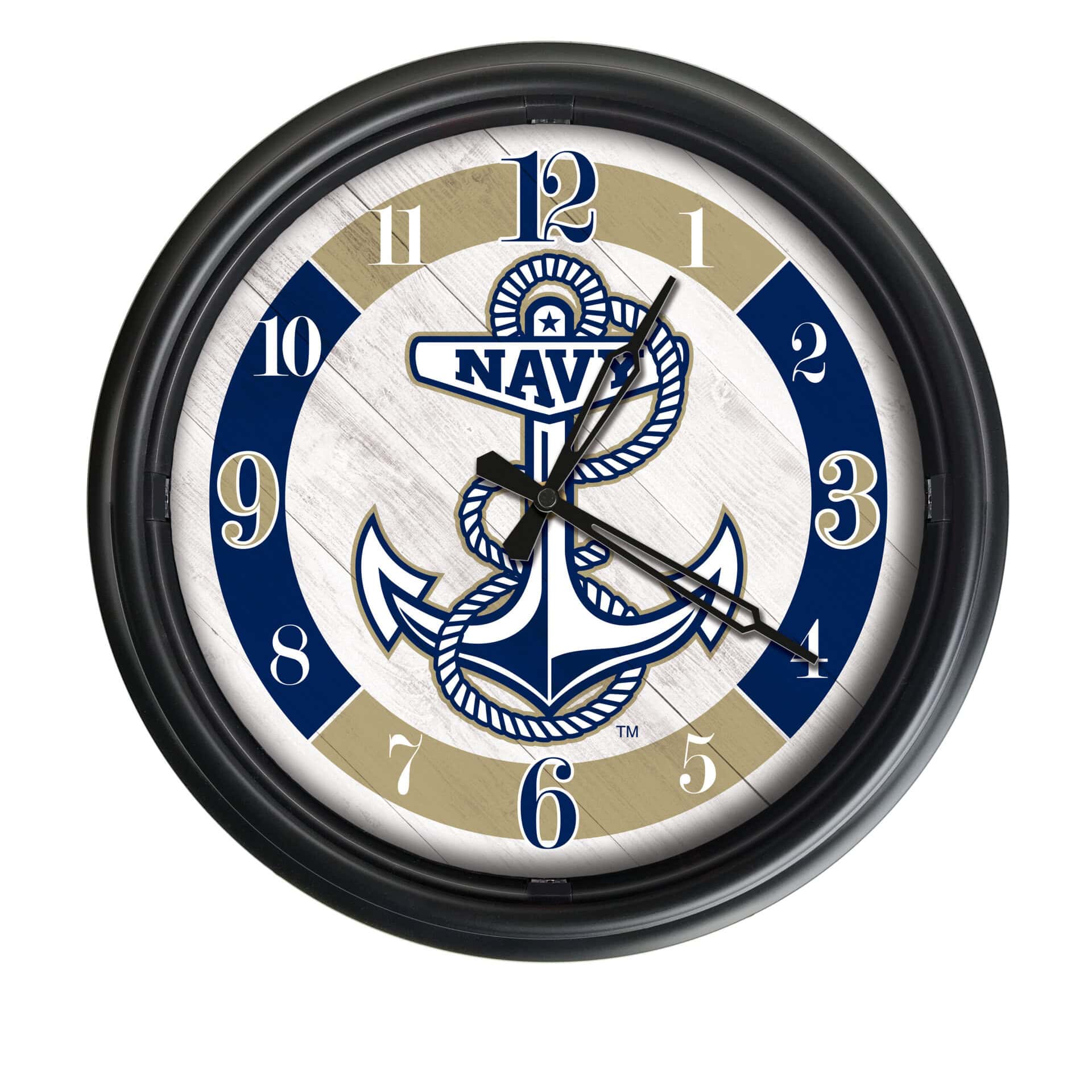 The US Naval Academy 14-Inch Indoor/Outdoor LED Wall Clock in Black is the perfect addition to any space, showcasing your school pride while ensuring functionality and durability. Designed for both indoor and outdoor use, this clock features a robust construction with a UV resistant black ABS plastic casing and a rubber gasket-sealed glass face lens to protect against the elements. The vibrant, full-color UV printed artwork is officially licensed, ensuring a fade-free design for years to come. With its innovative photo eye technology, the LED lights automatically illuminate the clock face in low light conditions, providing visibility at all times. This clock is not only a stylish piece of decor but also a reliable timekeeper powered by an accurate quartz movement.