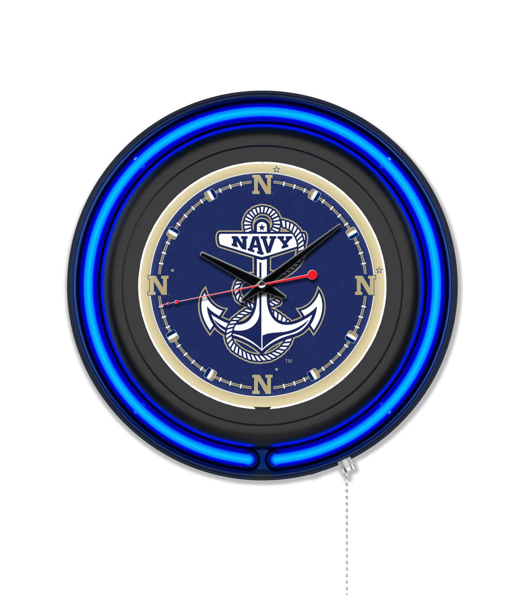The US Naval Academy 15-Inch Neon Logo Clock in Black is the perfect addition to any man cave, showcasing your school pride in a vibrant and stylish way. With its striking black casing and neon outer ring featuring team colors, this clock is not only functional but also a stunning decor piece. The custom printed clock face is illuminated by a brilliant white inner neon ring, creating an eye-catching display. The pull chain mechanism allows for easy on/off operation, while the accurate quartz movement ensures you always keep track of time.
