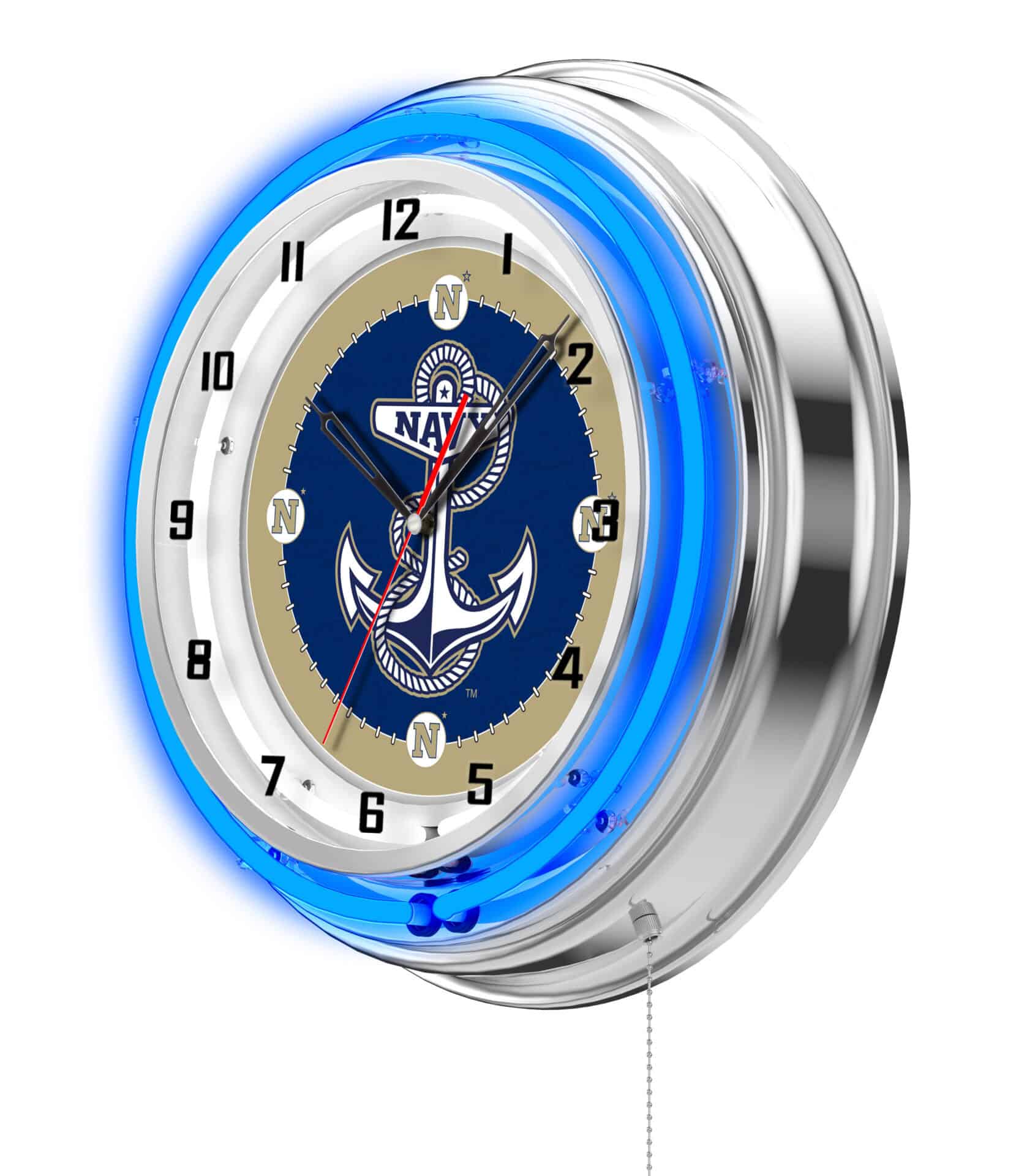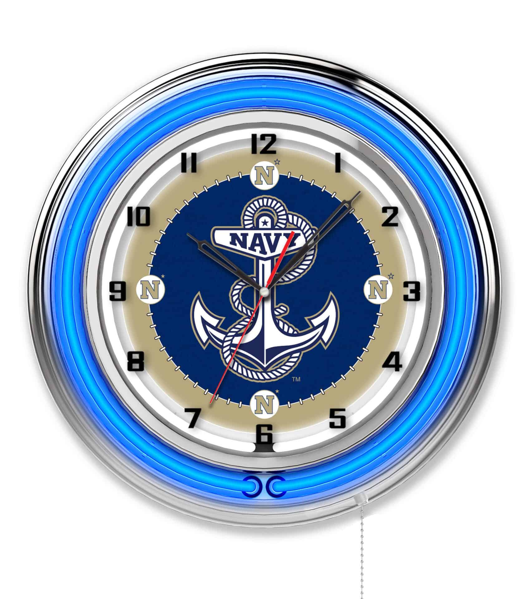 The “US Naval Academy 19-Inch Neon Logo Clock in Chrome is the perfect addition to any man cave, showcasing your school pride with its vibrant design and functional features. This clock features a durable chrome casing and a team color-specific neon outer ring that beautifully complements the custom printed clock face, illuminated by a brilliant white inner neon ring. With a convenient pull chain for easy on/off operation, you can easily control the neon lights. The clock is powered by a UL Listed power transformer that connects to a standard 120V outlet, while the accurate quartz movement ensures precise timekeeping, powered by a single AA battery (not included). This clock makes a fantastic gift for graduates, sports fans, or anyone looking to enhance their decor.
