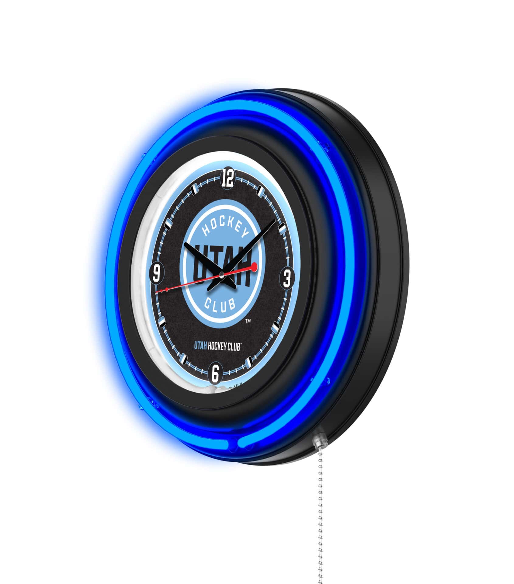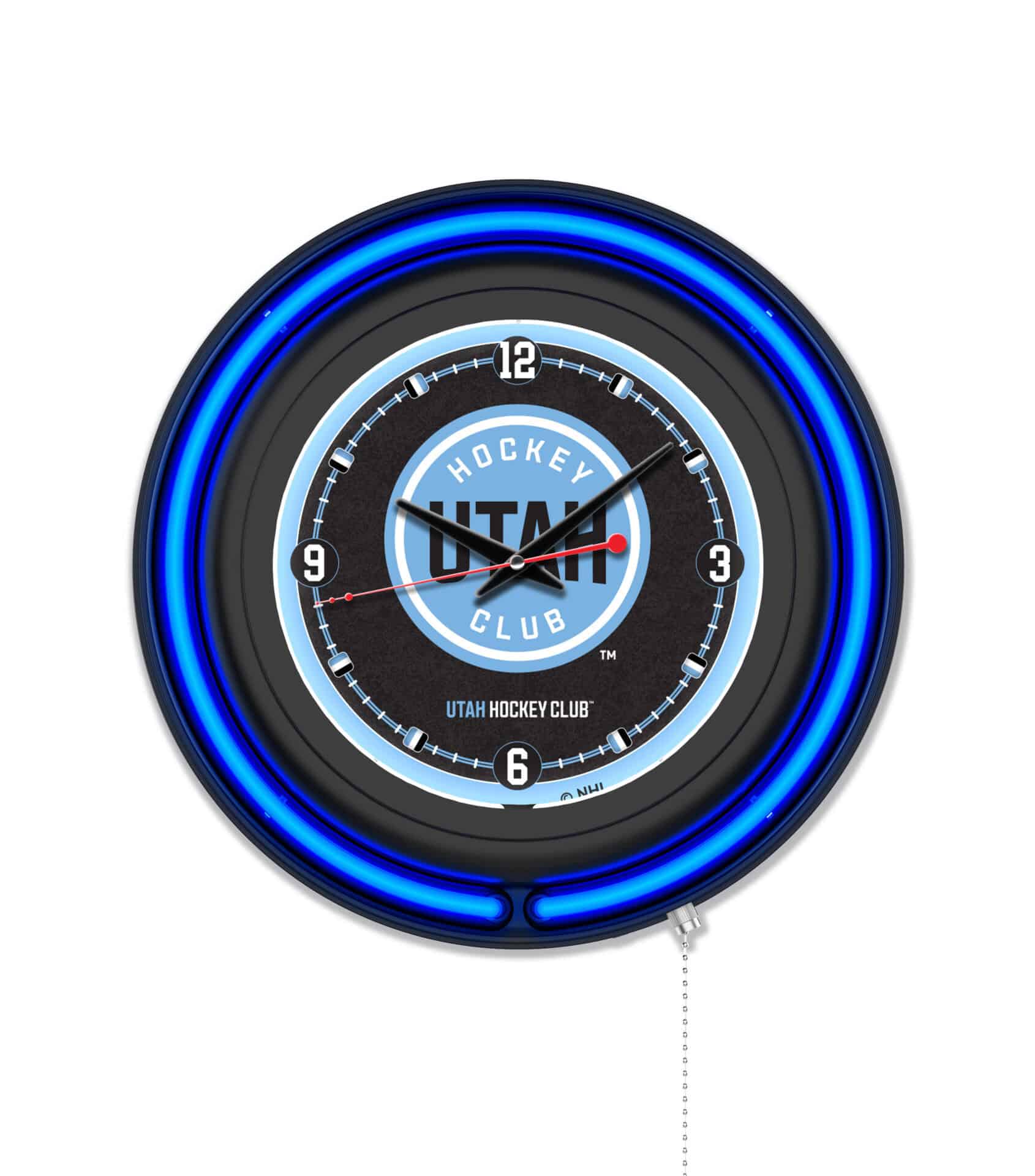 The “Utah Hockey Club 15-Inch Neon Logo Clock in Black” is an eye-catching addition to any sports fan’s collection. Featuring a striking black casing with a vibrant neon outer ring, this clock not only tells time but showcases your team pride in style. The custom printed clock face is illuminated by a brilliant white inner neon ring, creating a stunning visual effect. The neon rings can be easily turned on and off with a convenient pull chain. Powered by a UL Listed power transformer, this clock works with a standard 120V outlet, while the accurate quartz movement ensures you’re always on time. Perfect for gifting or personal use, this clock combines functionality and team spirit.