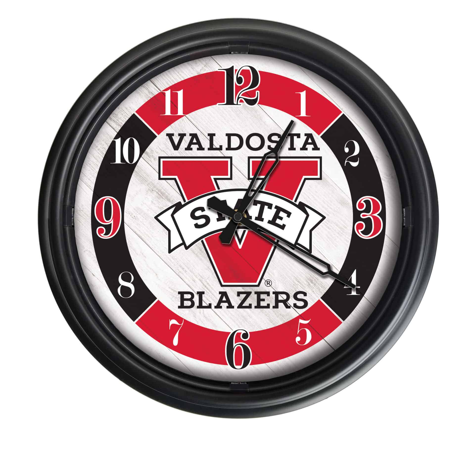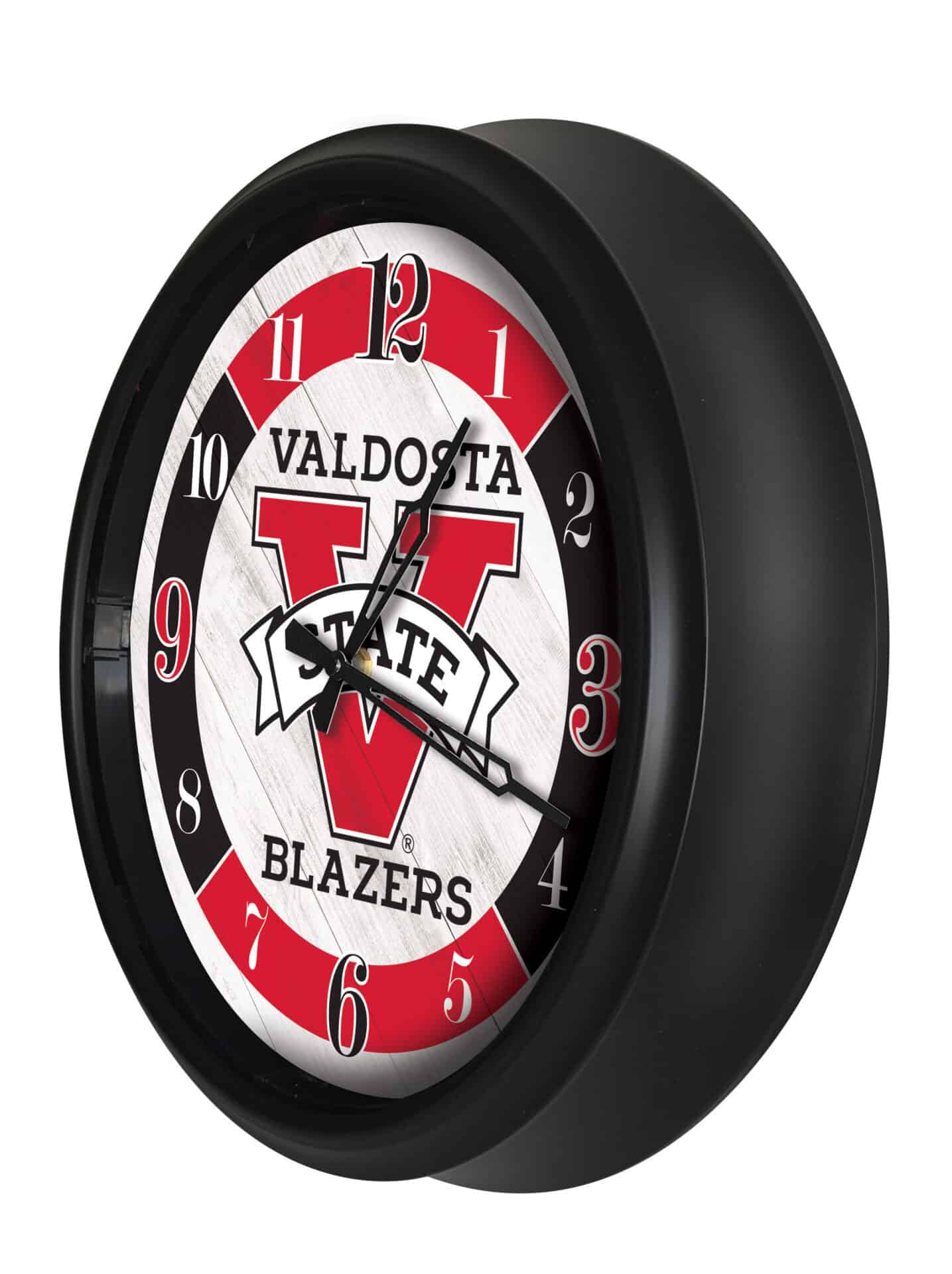 The Valdosta State University 14-Inch Indoor/Outdoor LED Wall Clock in Black is the perfect addition for any fan looking to showcase their school pride. Designed for both indoor and outdoor use, this clock features a durable, weather-resistant construction with a sleek black ABS plastic casing. The vibrant, full-color artwork is digitally printed with UV inks, ensuring that it remains fade-free for years to come. With its photo eye-controlled LED lights, the clock face automatically illuminates in low light, making it not only functional but also a striking decorative piece.