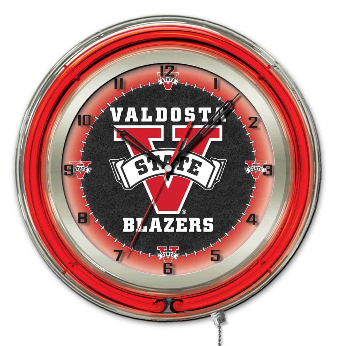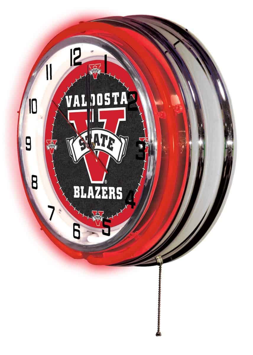 The Valdosta State University 19-Inch Neon Logo Clock in Chrome is a vibrant and stylish addition to any man cave, showcasing your school pride in a unique way. This clock features a sleek chrome casing and a neon outer ring in team colors, beautifully illuminating the custom printed clock face with a brilliant white inner neon ring. The neon rings can be easily activated with a pull chain, and the clock operates on a standard 120V outlet, ensuring convenience and ease of use. With accurate quartz movement powered by a single AA battery (not included), this clock not only serves as a decorative piece but also ensures you keep track of time accurately.