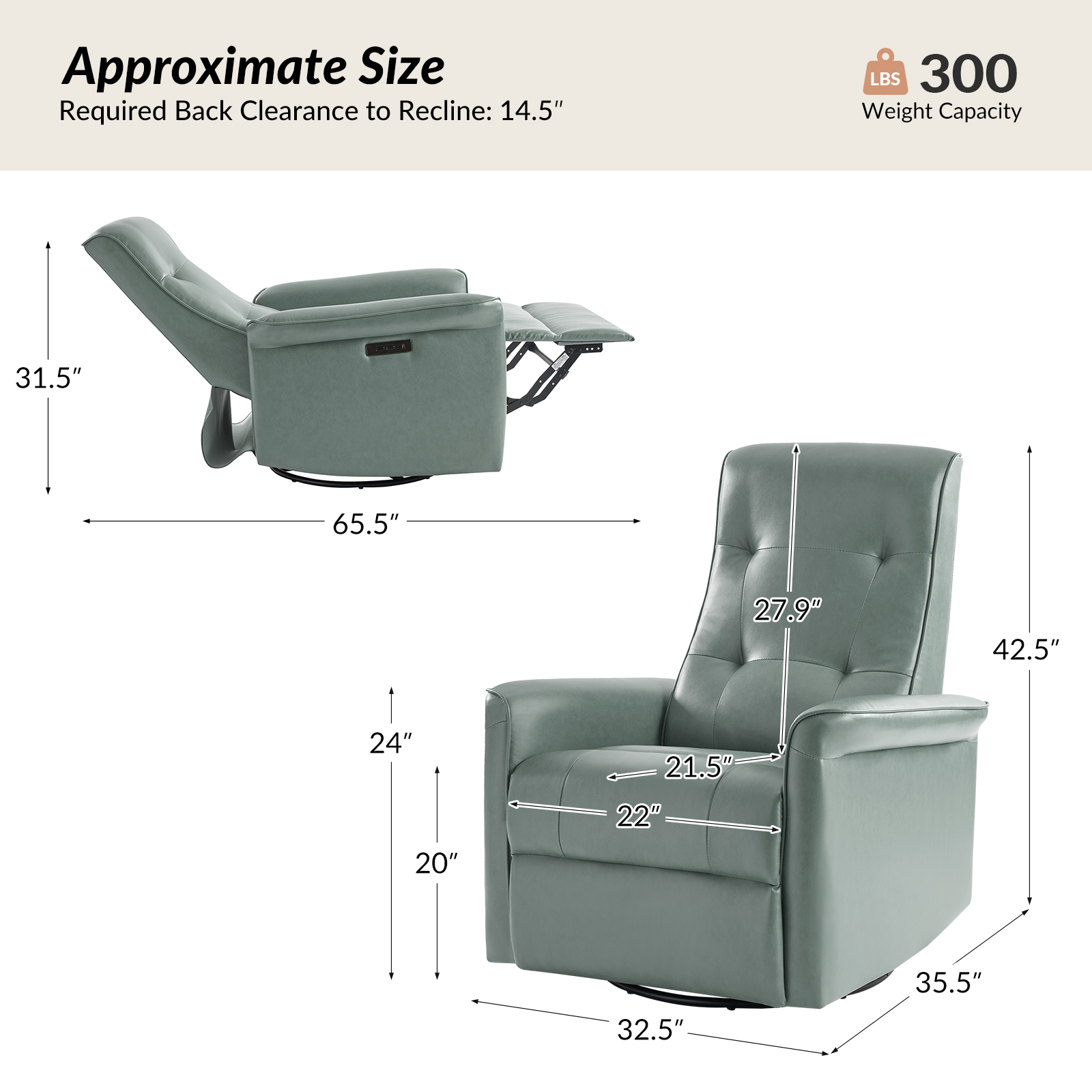 Experience unparalleled comfort and modern convenience with the Valentin Sage Vegan Leather Swivel Rocking Power Recliner. This stylish recliner seamlessly blends into your bedroom or living room, offering a relaxing retreat with its smooth rocking motion, customizable reclining angles, and convenient USB charging ports. The rotating metal base provides effortless movement, while the tufted detailing and outward-folding armrests enhance both style and comfort.