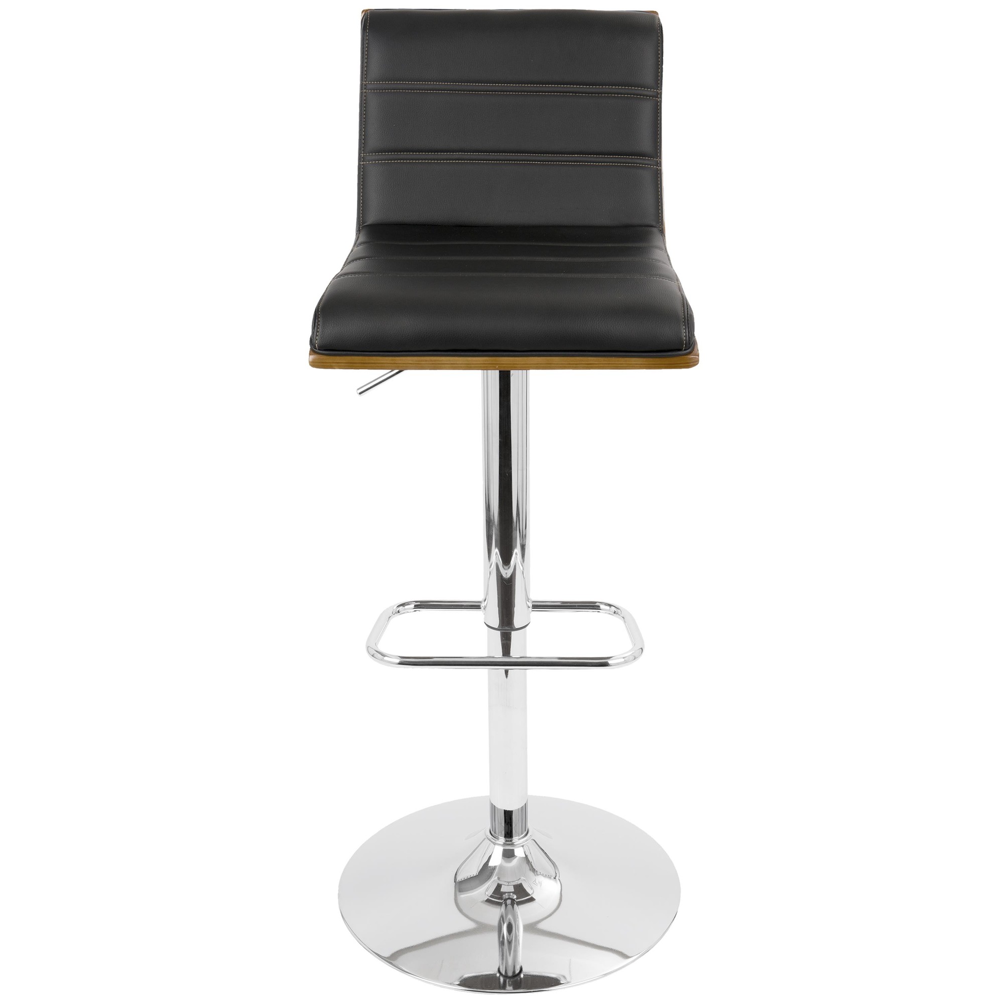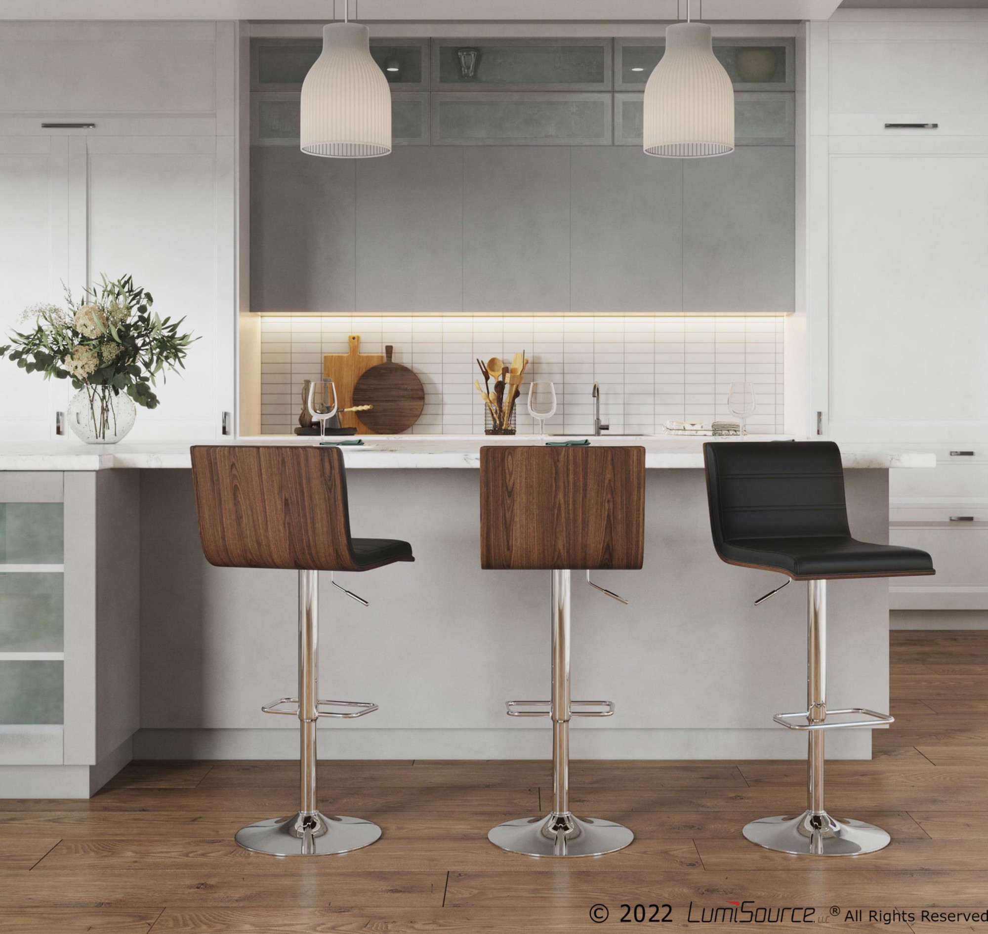 The Vasari Barstool blends style and comfort, making it a perfect addition to your kitchen or home bar. Its fashionable bent wood backrest provides excellent support, while the padded, upholstered seat ensures comfortable seating. Contrasting stitching adds a touch of elegance, and the chrome footrest and base offer durability and style. The adjustable height and 360-degree swivel enhance its functionality.