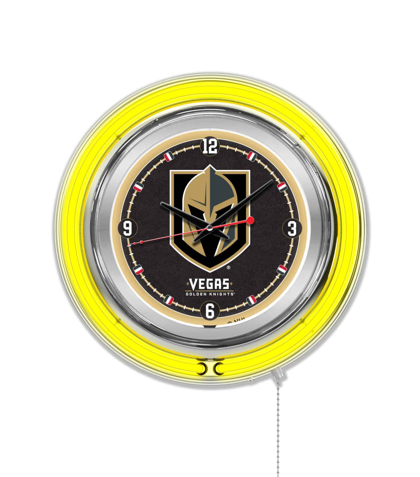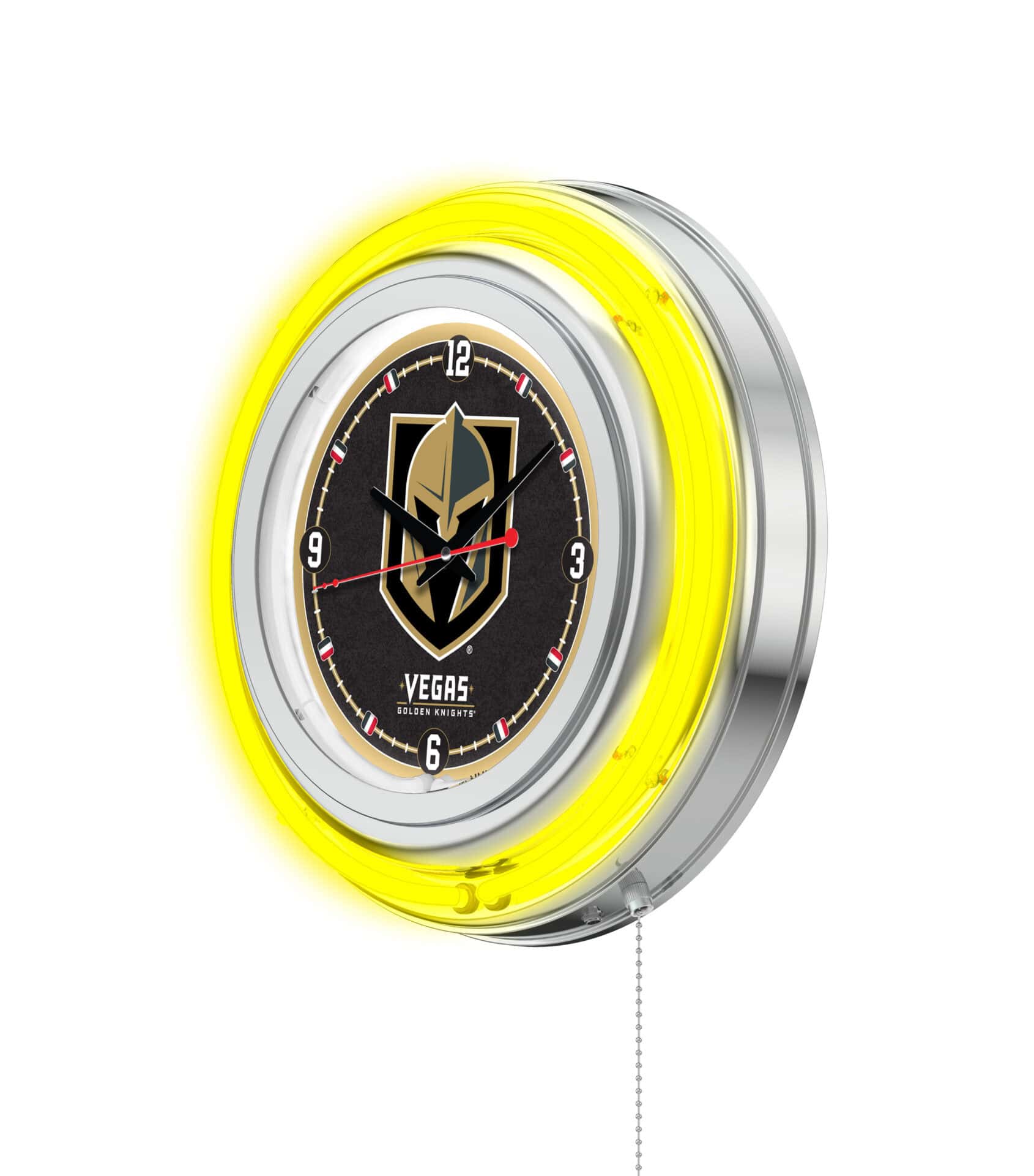 The Vegas Golden Knights 15-Inch Neon Logo Clock in Chrome is the ultimate statement piece for any sports enthusiast’s space. This stunning clock features a sleek chrome casing and a vibrant neon outer ring that showcases your team pride. The custom printed clock face is illuminated by a brilliant white inner neon ring, providing an eye-catching display. With a convenient pull chain for easy on/off operation, this clock not only enhances your decor but also ensures accurate timekeeping thanks to its reliable quartz movement. Perfect as a gift or for personal use, it’s designed to impress.