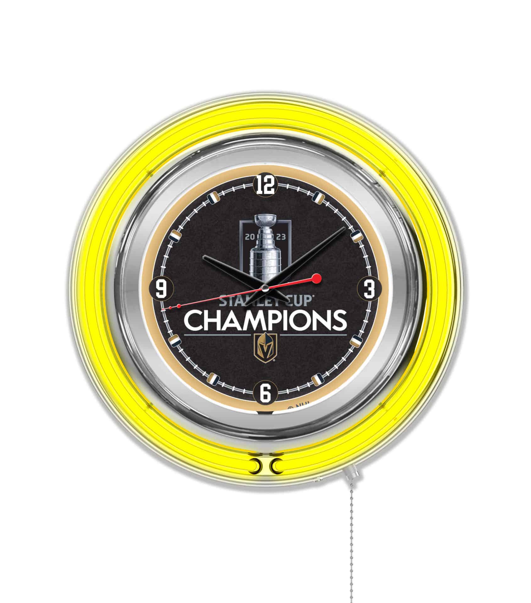 Celebrate the 2023 Stanley Cup Champs with this stunning neon logo clock featuring the Vegas Golden Knights. This clock combines a sleek chrome casing with vibrant team colors, making it a perfect addition to any man cave. The custom printed clock face is beautifully illuminated by a brilliant white inner neon ring, while the outer neon ring adds a striking accent. With easy operation and accurate timekeeping, this clock is not just a decorative piece but also a functional accessory.