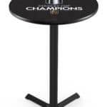 Celebrate the 2023 Stanley Cup champions with this officially licensed 36-inch pub table. Designed to elevate your bar, game room, or man cave, this table combines durability, elegance, and functionality. Featuring a vibrant, full-color laminate top with a scratch-resistant finish, this table ensures long-lasting use while maintaining its sleek appearance. The commercial-quality cross base, powder-coated in a black wrinkle finish, guarantees stability and a modern aesthetic. Adjustable feet provide adaptability to various floor surfaces, and the environmentally friendly construction ensures a sustainable choice. Easy assembly and maintenance make this pub table a must-have for any enthusiast looking to enhance their space.
