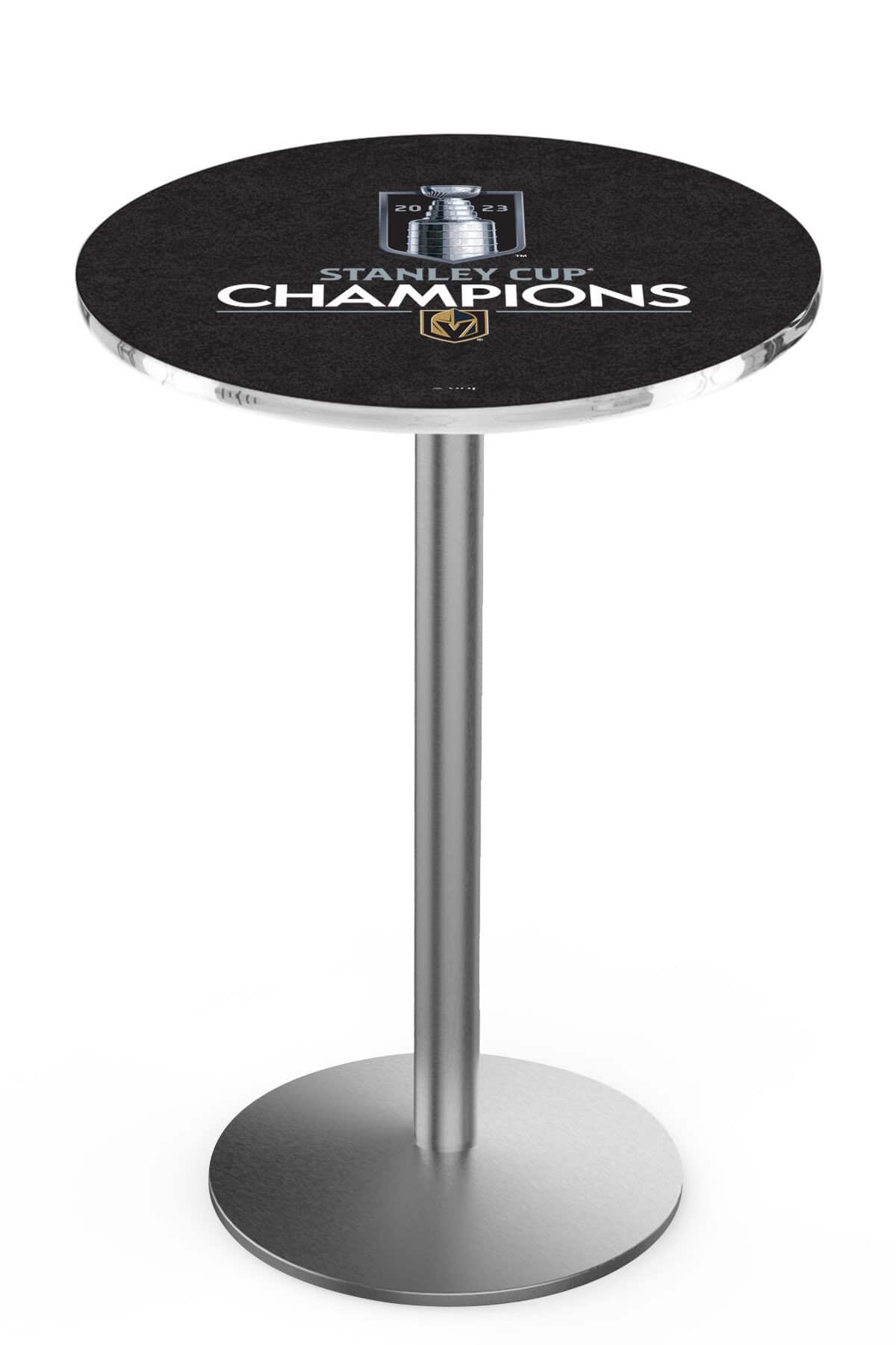 Celebrate the 2023 champions with this officially licensed pub table, designed for fans who demand both style and quality. This 36-inch pub table features a round base with a modern stainless finish, making it a perfect addition to any bar, game room, or man cave. The table boasts a vibrant, full-color, sublimated laminate top that is scratch-resistant and attached using environmentally friendly adhesives. Its commercial-grade base ensures durability, stability, and easy assembly, while adjustable feet accommodate uneven surfaces. Elevate your space with this premium-quality table, built to last and impress.