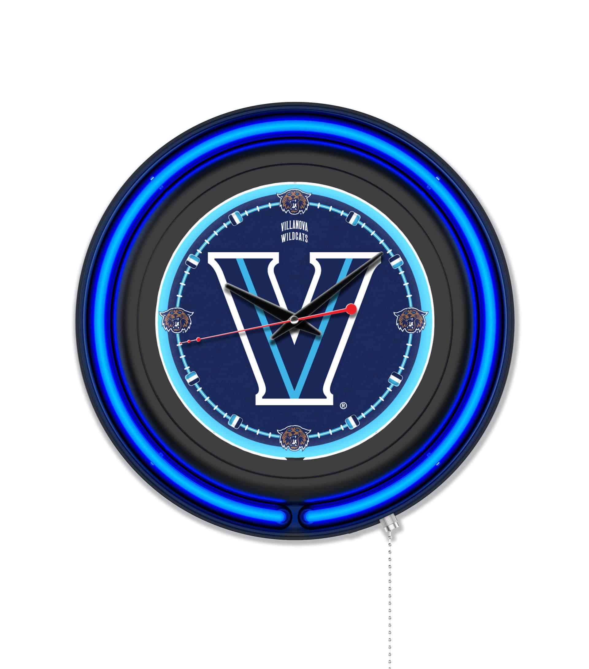 The Villanova University 15-Inch Neon Logo Clock in Black is the perfect addition to any man cave, showcasing your school pride while providing functional timekeeping. Featuring a sleek black casing, this clock is adorned with a vibrant team-colored neon outer ring and a brilliant white inner ring that illuminates the custom printed clock face. The neon rings are effortlessly activated with a convenient pull chain, allowing you to add a touch of ambiance to your space. With accurate quartz movement, this clock ensures precise timekeeping and operates on a single AA battery (not included). Ideal as a gift for graduates, sports enthusiasts, or as a stylish accent for your own collection, this clock combines functionality with team spirit.