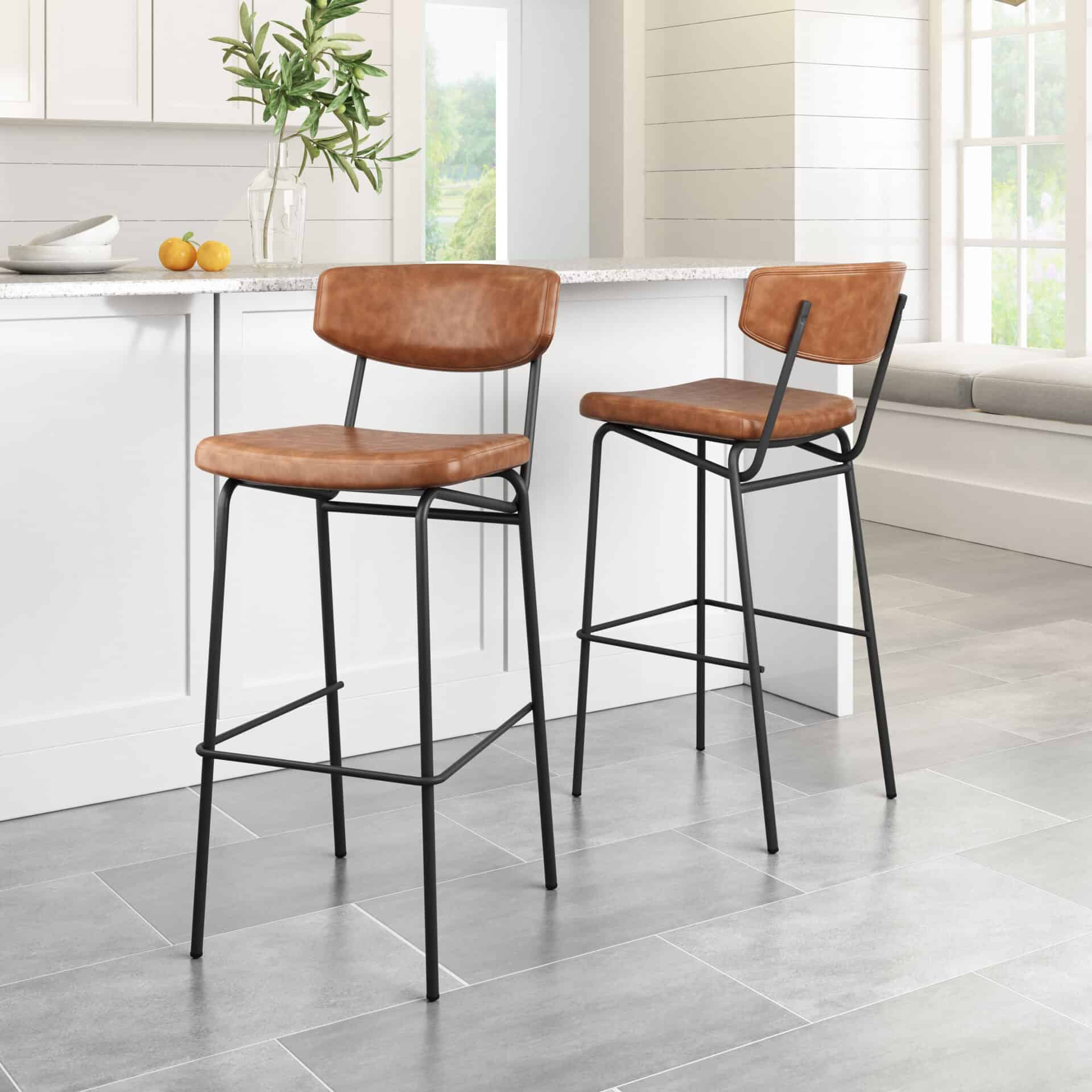 The **Vintage Brown Faux Leather Barstools with Steel Frame (Set of 2)** offer a blend of comfort and industrial style, perfect for enhancing your man cave, bar, or kitchen. These barstools feature a durable steel frame with powder-coated legs and are wrapped in plush faux leather for a sleek, modern look. Whether your space leans towards minimalism or boho-industrial, these barstools provide a stylish and functional seating solution. Complete with a built-in footrest and rubber feet for floor protection, they support up to 350 lbs, ensuring both comfort and durability.