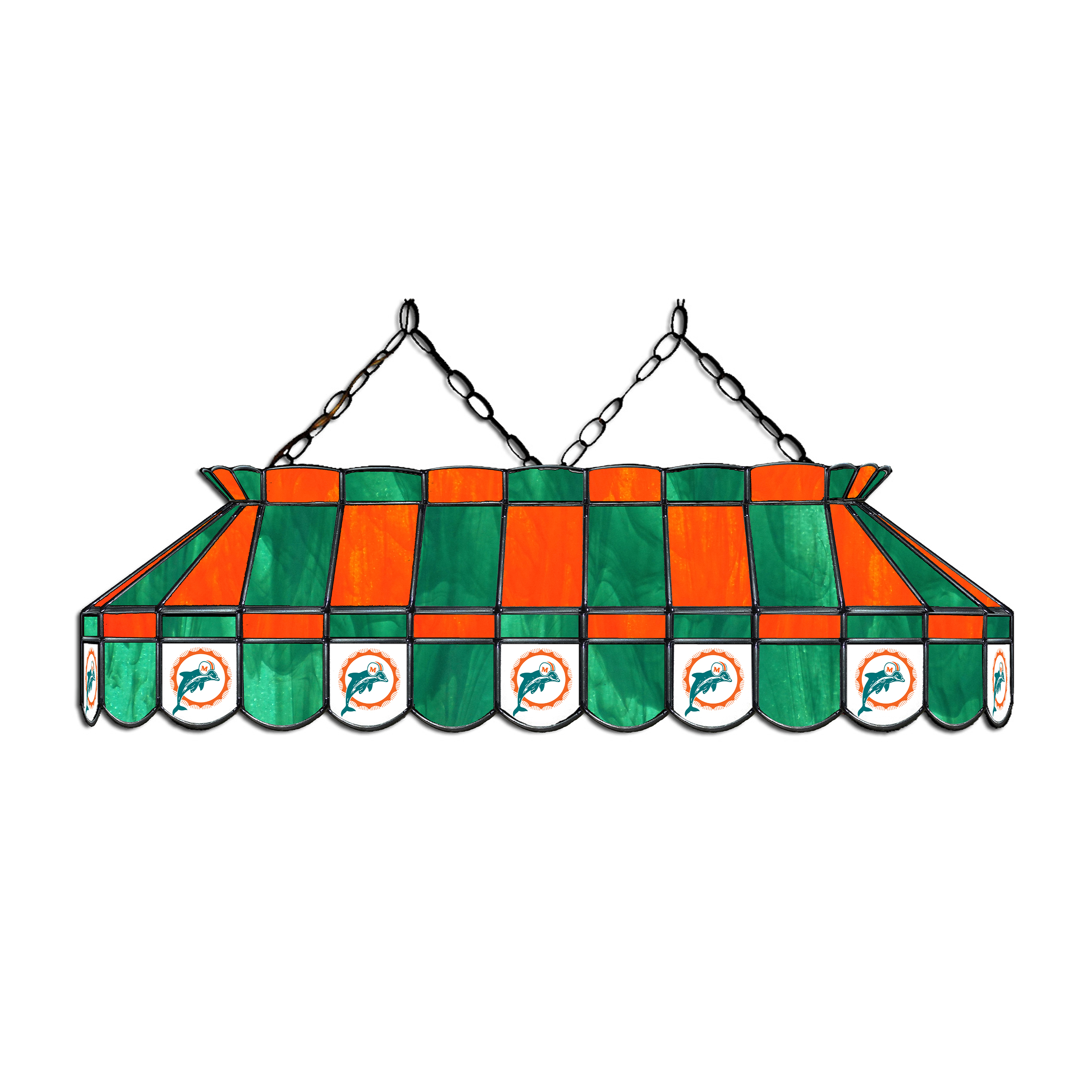 Elevate your game room with the Vintage Dolphins 40 Inch Stained Glass Billiard Lamp. This stunning lamp is crafted with hand-cut stained glass, featuring the team’s vibrant colors and logos. Each shade includes multiple licensed logos, screen-printed directly onto the glass for a professional finish. Proudly made in the USA, this 40″ lamp adds a touch of sophisticated team spirit to any space. The lamp includes hanging chain and ceiling mounting hardware for easy installation. Dimensions (LxWxH): 40 x 16 x 16. Product Weight (lbs): 40. Material: Hand cut glass, metal.