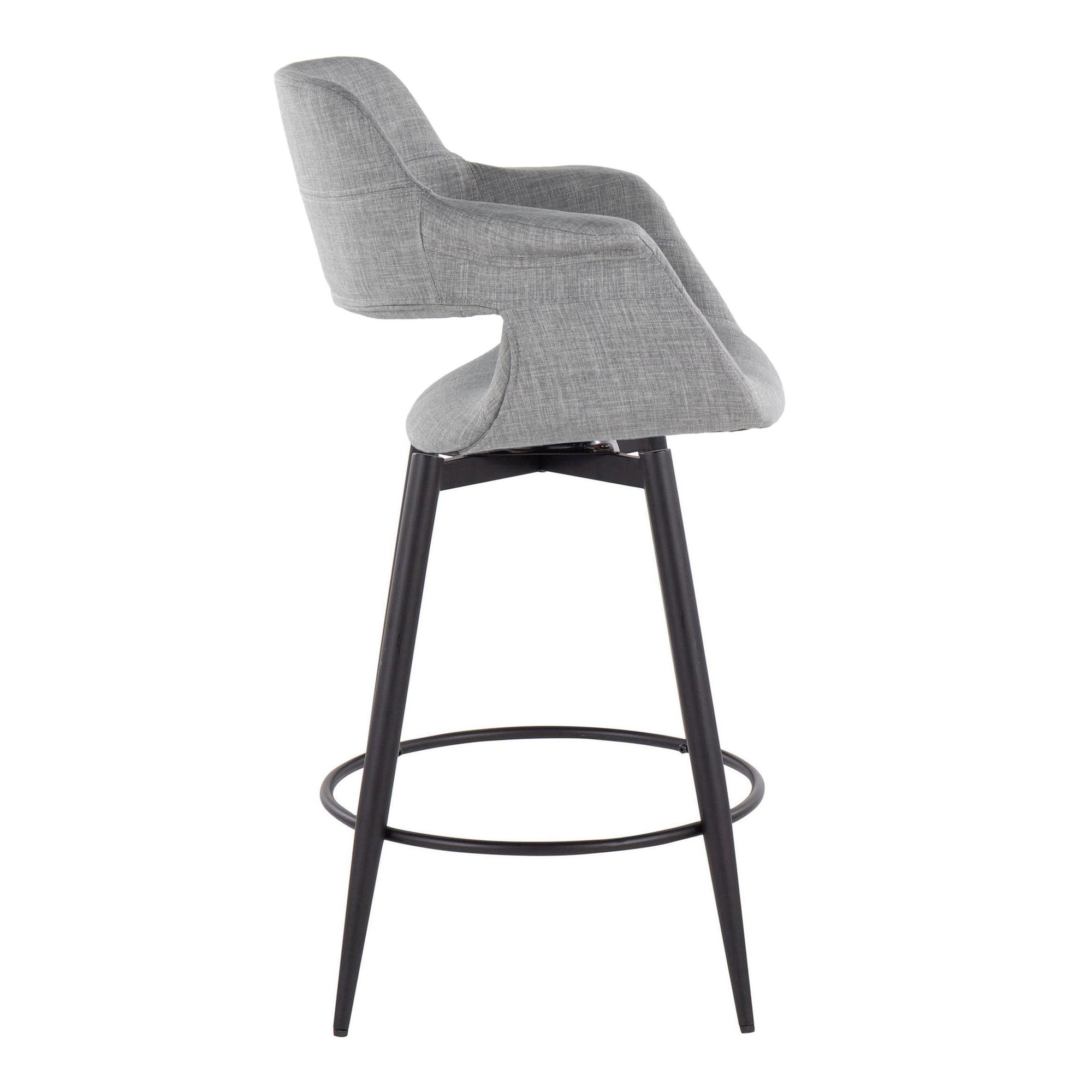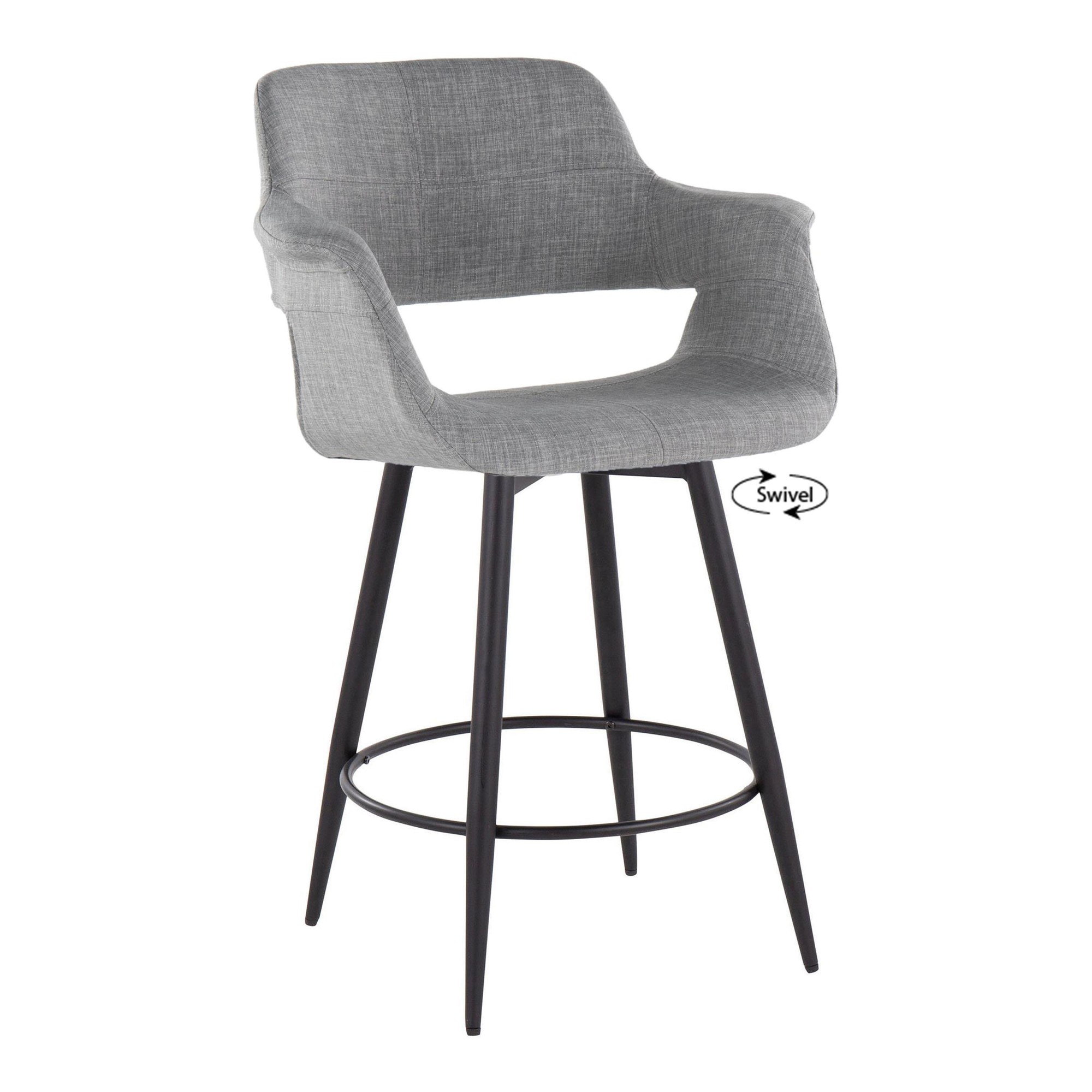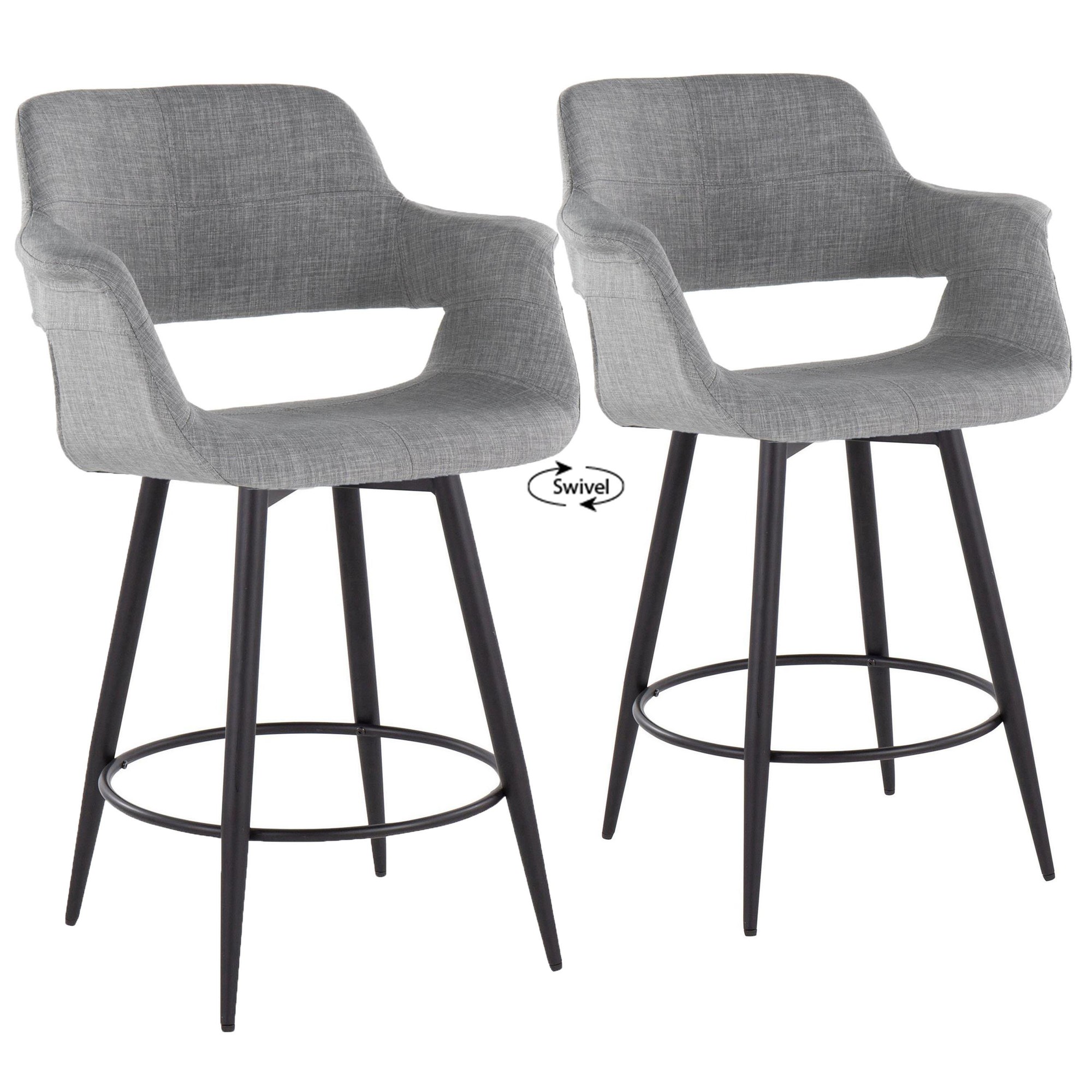 These counter stools feature a fixed counter height and a 360-degree swivel, providing both comfort and functionality. The stylish light grey fabric upholstery adds a touch of elegance, while the tapered metal legs with a round black metal footrest provide stability and support. This set includes two counter stools, allowing you to effortlessly create a cohesive and inviting seating area.
