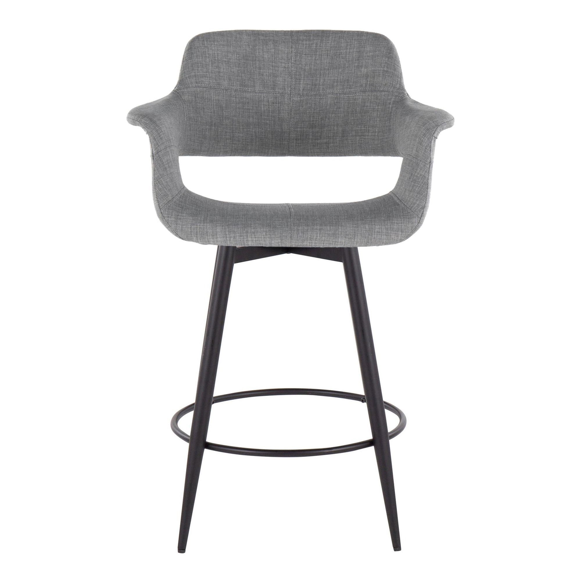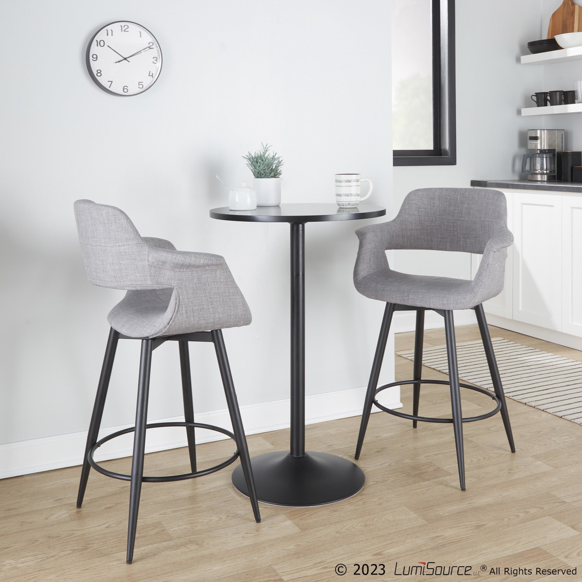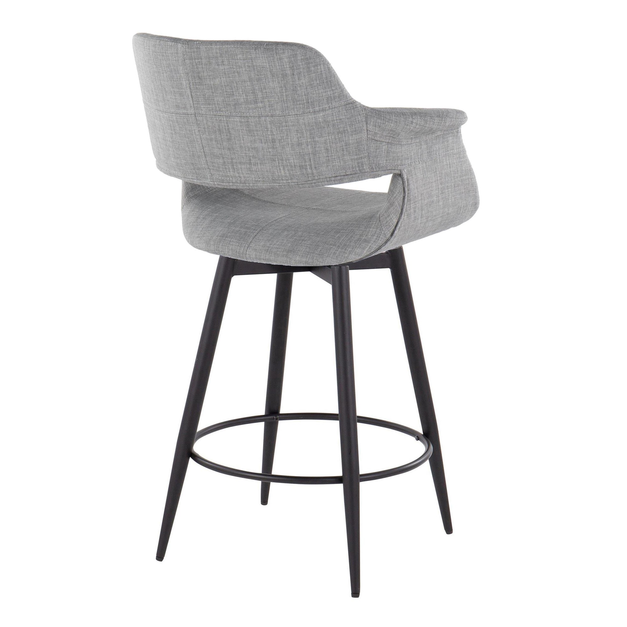 These counter stools feature a fixed counter height and a 360-degree swivel, providing both comfort and functionality. The stylish light grey fabric upholstery adds a touch of elegance, while the tapered metal legs with a round black metal footrest provide stability and support. This set includes two counter stools, allowing you to effortlessly create a cohesive and inviting seating area.