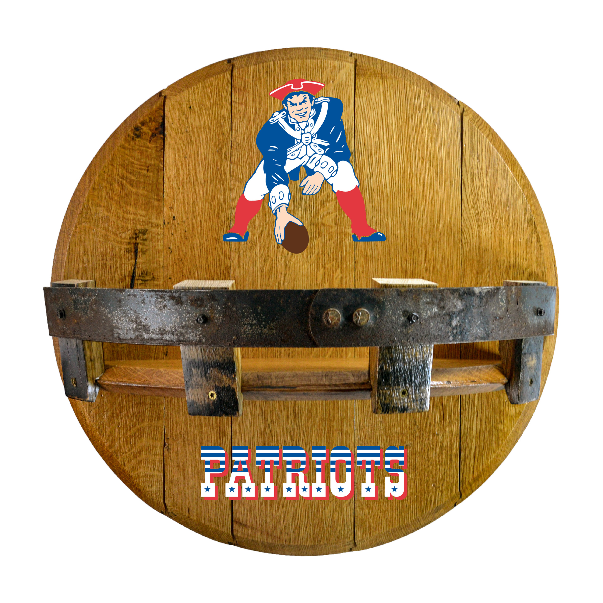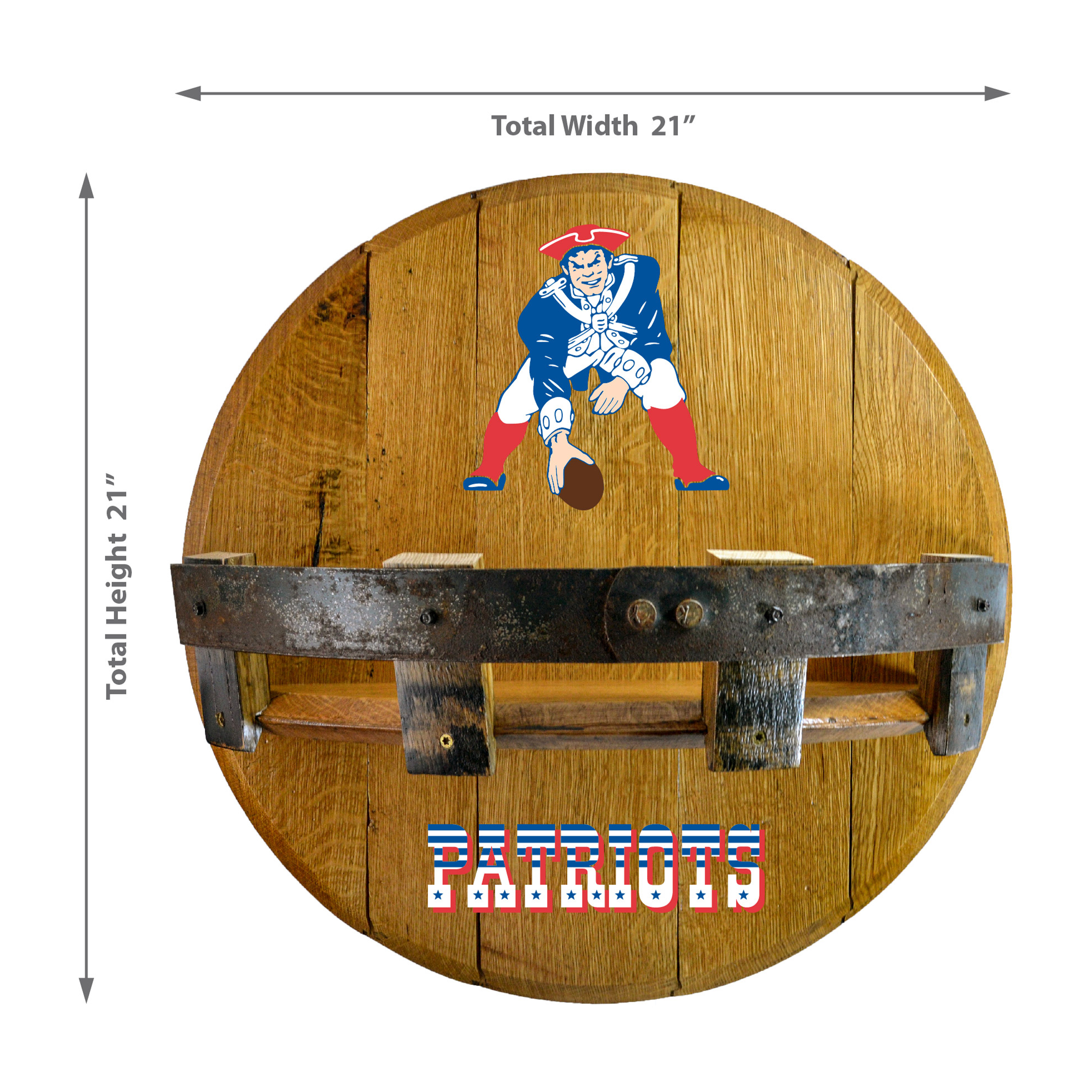 Show off your team spirit with this Vintage Barrel Bar Shelf! Made from an authentic reclaimed oak whiskey barrel head, this shelf is a unique addition to any fan cave. The original barrel ring is still attached! Barrel stave supports add to the authentic look. Each shelf is one-of-a-kind. Every reclaimed whiskey barrel top has unique features. The team logo is applied with UV-resistant ink and then sealed. The dimensions (LxWxH) are 21 x 9.5 x 21 inches, and the product weight is 17 lbs. The material is oak and metal. It’s made in the USA and licensed by the NFL.