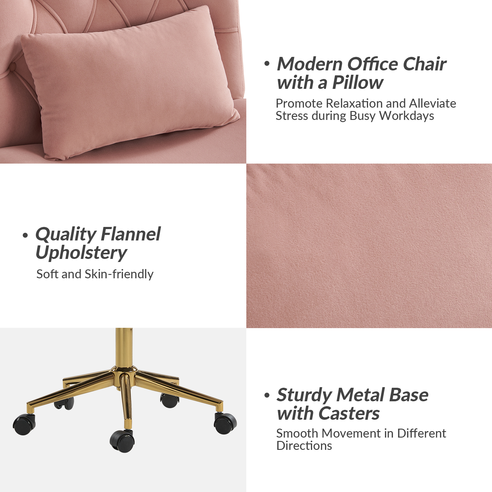 Upgrade your man cave office with this Violet Pink Flannel Ergonomic Swivel Office Chair. This chair has soft flannel upholstery for comfort. It has metal feet with smooth casters for easy movement. The supportive pillow is designed for your lower back, helping you sit up straight. The swivel seat lets you turn easily. You can change the height to fit you best. The chair also has a tilting mechanism for relaxing. This task chair is a great mix of looks and usefulness for a good work space. It has dimensions of 23 x 27 x 32-36 inches. The seat dimensions are 23 x 20 x 18.5-22.5 inches. It weighs 23.81 lbs. The material is velvet, wood, metal, and foam. The color is pink. Some assembly is needed.
