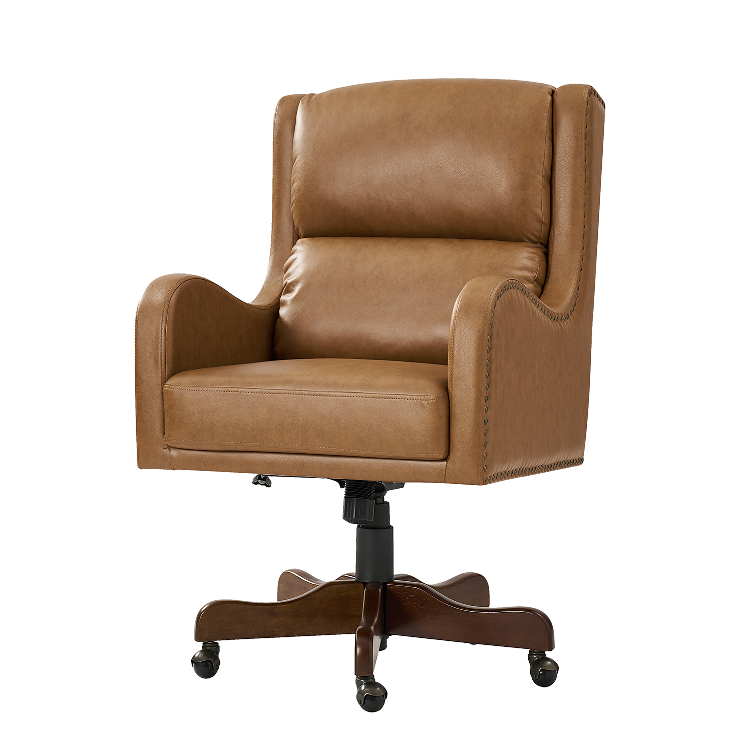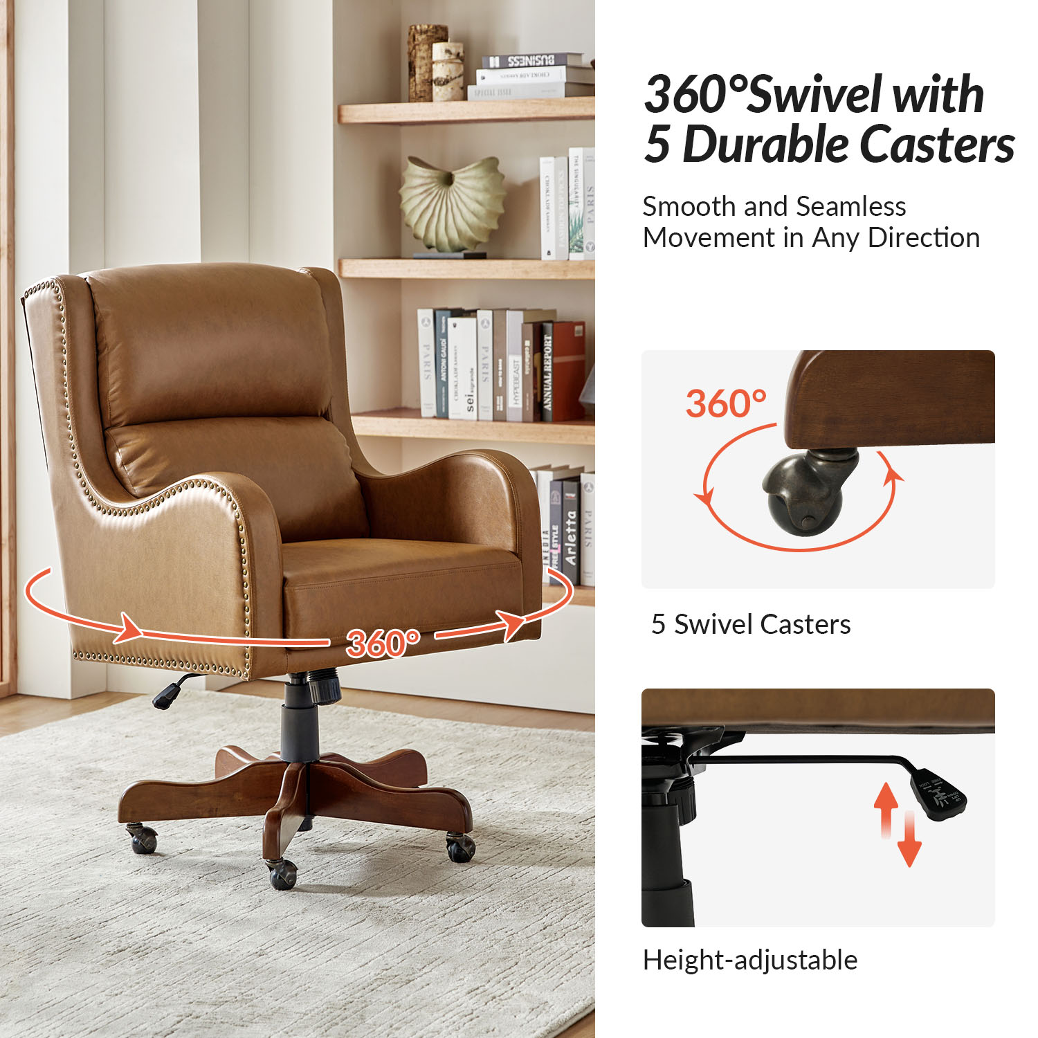 Elevate your home office with this stylish executive task chair. Combining durability and mobility, this transitional-style chair features solid wood legs with smooth casters. Enjoy a dynamic sitting experience with its center tilt mechanism, adjustable seat height, and spring-packed cushion, all designed for personalized comfort and ergonomic support. Upholstered in premium vegan leather, this chair offers a waterproof and easy-to-clean solution, catering to both aesthetic and practical preferences.