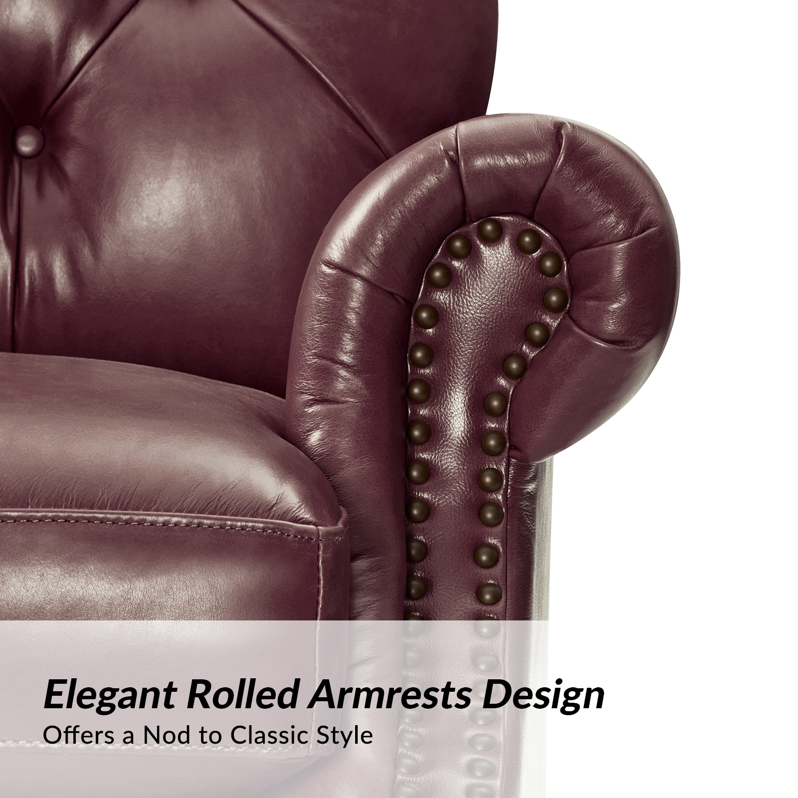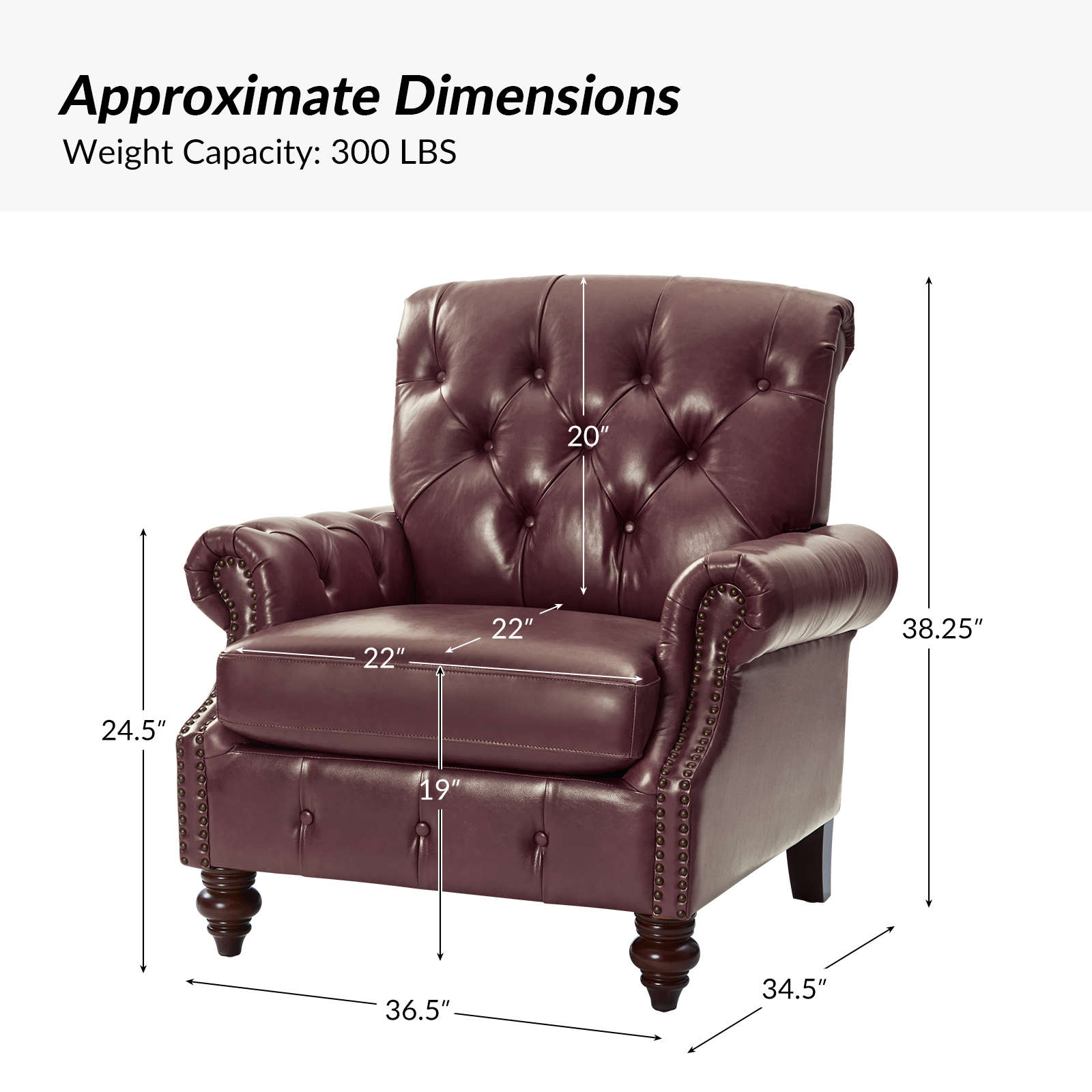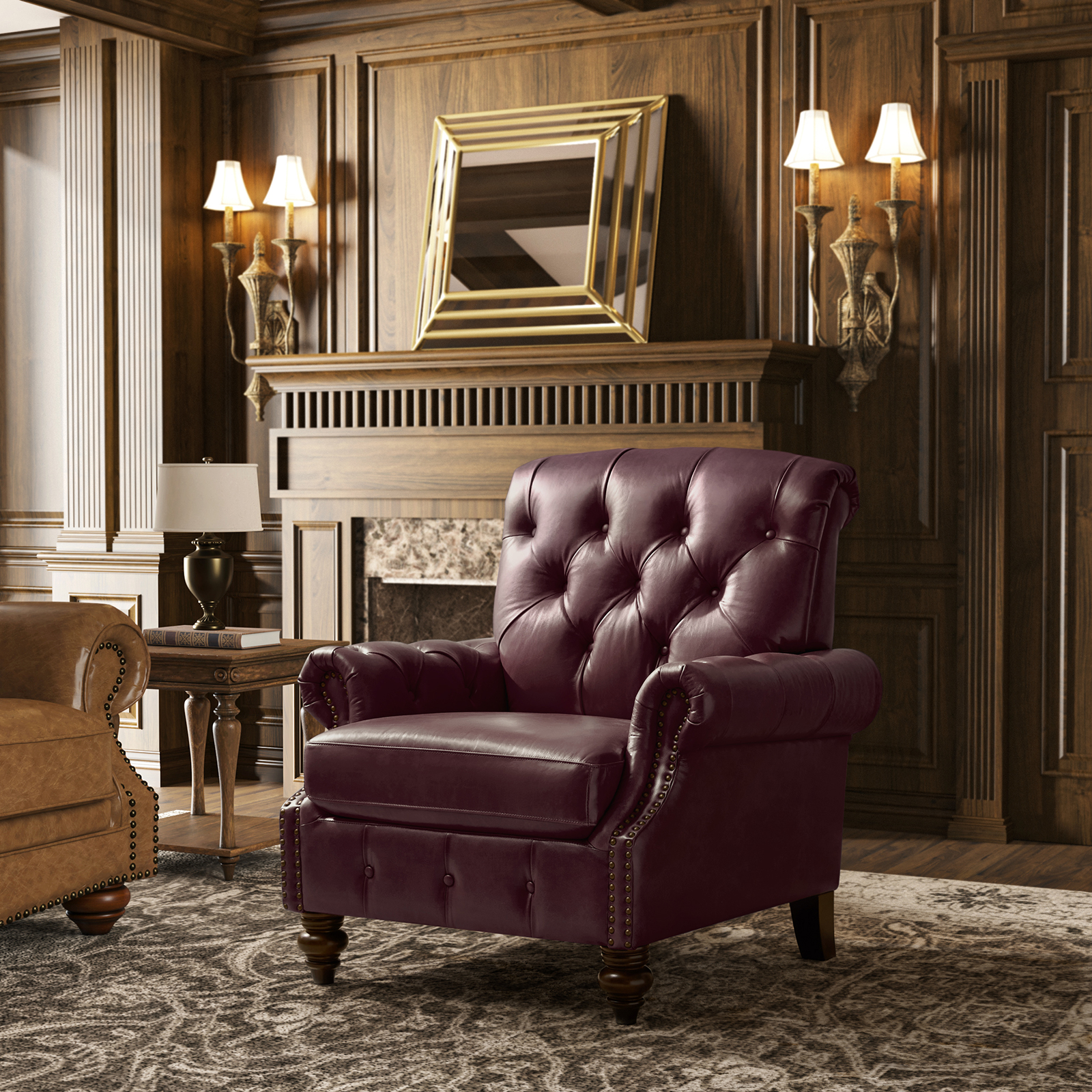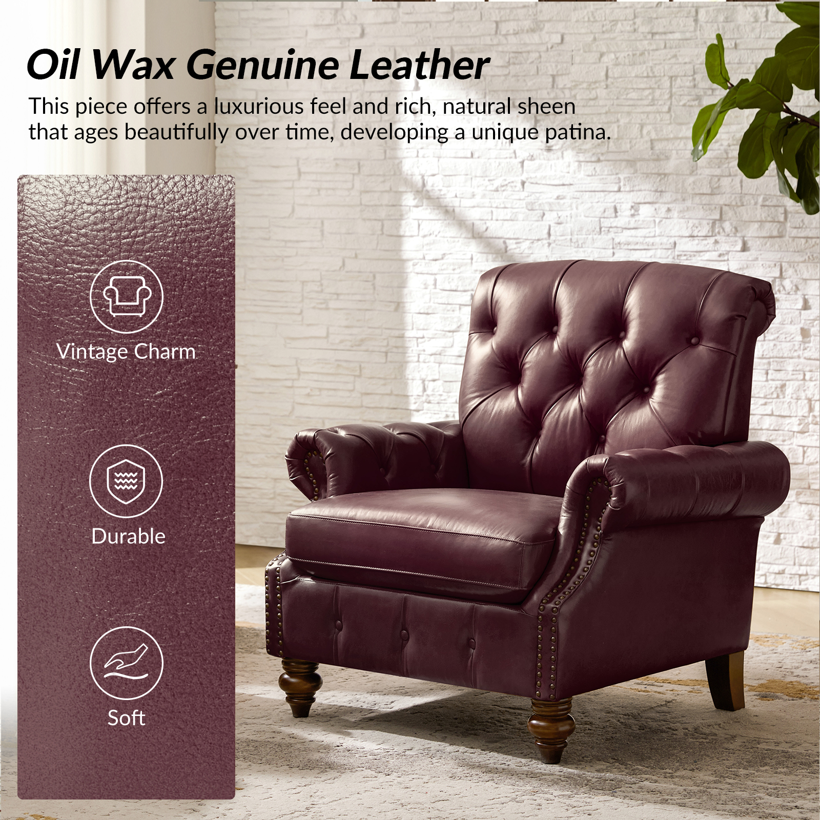 This exquisite armchair combines timeless elegance with classic craftsmanship. Upholstered in breathable waxed genuine leather, it brings a traditional charm to any room. The rolled arm design offers classic style and comfort, while the meticulous tufting adds refined sophistication. Copper nailhead trim provides a striking contrast, and the spindle legs complete the look with grace and sturdiness. This armchair is a statement of enduring style and luxury.
