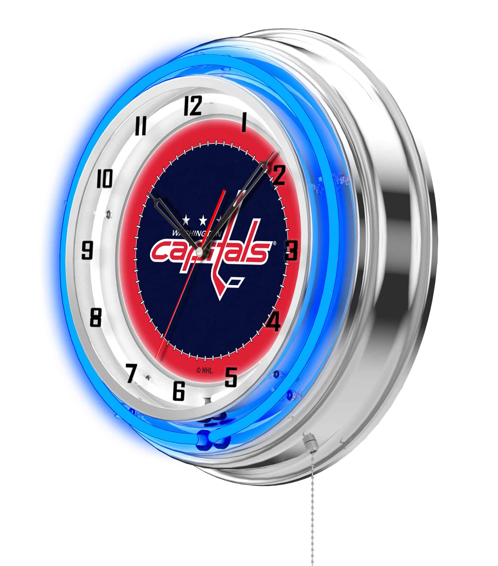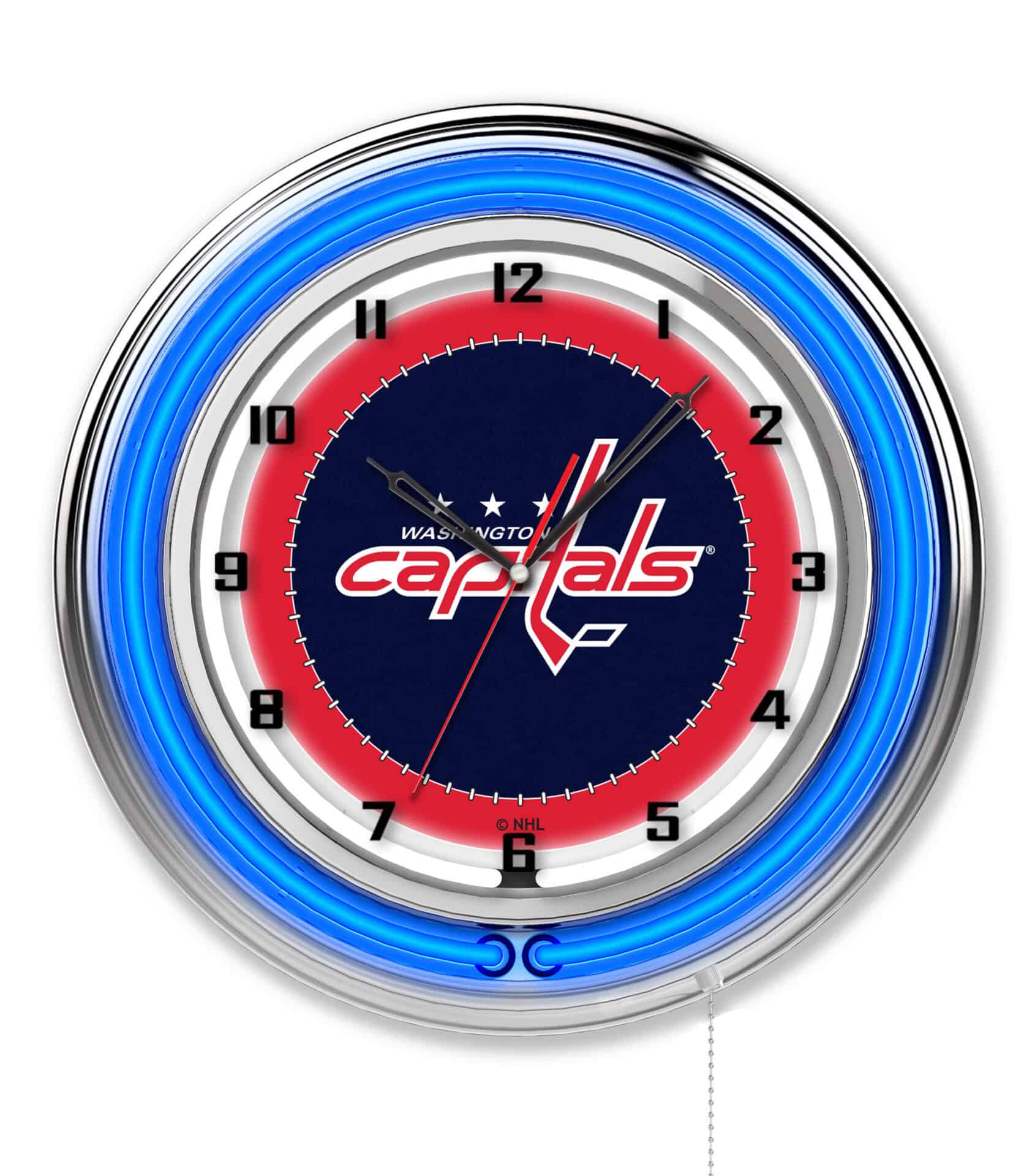 The Washington Capitals 19-Inch Neon Logo Clock in Chrome is a striking addition to any fan’s collection, perfect for showcasing team pride in your man cave. This clock features a vibrant, officially licensed design with a chrome casing that complements the neon outer ring in team colors. The clock face is illuminated by a brilliant white inner neon ring, ensuring that it remains visible at all times. With easy operation via a pull chain, this clock combines functionality with style, making it an ideal gift for sports enthusiasts or a great way to enhance your own space.